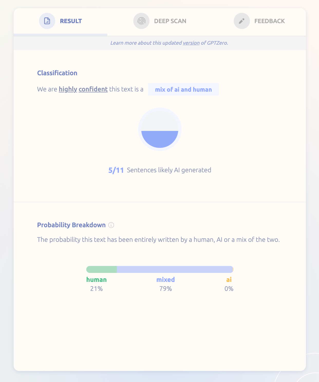 GPTZero is leading the next phase of AI writing understanding with more sophisticated AI recognition algorithms. That’s why we’re pleased to announce that GPTZero mixed detection model that precisely evaluates text that’s a blend of human writing and AI outputs.
