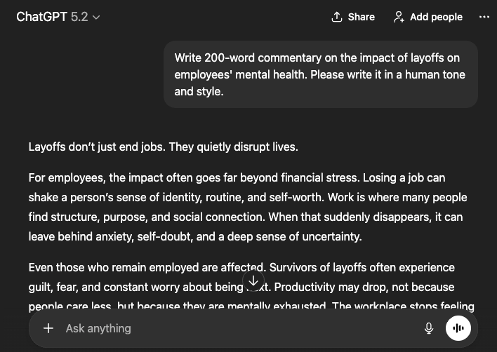 Let’s generate a 200-word commentary by ChatGPT on the impact of layoffs on employees' mental health in a human writing style.