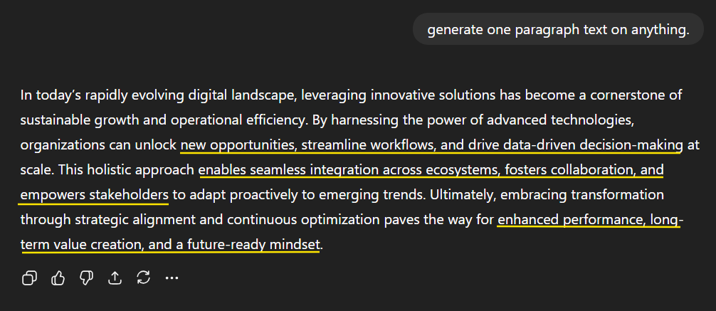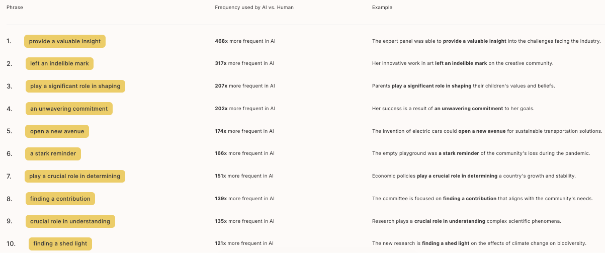 And it’s not just words and phrases. AI overuses entire constructions. The infamous "in today's fast-paced world" opener comes to mind. But there are plenty of others. "Play a crucial role in determining," "it's important to note that," "a myriad of," and the list is never-ending.