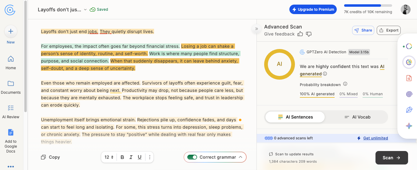 GPTZero’s AI detector also highlights the specific sentences that are the most AI-sounding. You’ll be saving time by fixing only the sentences that are causing AI detection.