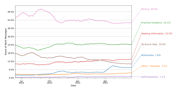 And people in management and business roles are the heavy users here. The study finds that more than half of all their work prompts are writing-related.