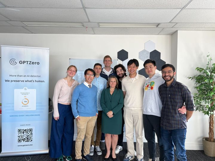 Today, Deputy Prime Minister Chrystia Freeland took the time to meet the GPTZero team at our office in downtown Toronto to celebrate fostering a native Canadian startup with home-grown engineering talent. The visit to a leading AI detector underscores recent concerns over the growing instances of AI “deepfakes”, including one of Freeland herself. The team discussed potential policy initiatives, including recommendations to strengthen the implementation of the Artificial Intelligence and Data Act, Canada’s AI leadership through the $2.4 billion package aimed at boosting research, innovation, and productivity, and the mitigation of AI risks, especially to protect against misuse of AI technologies.