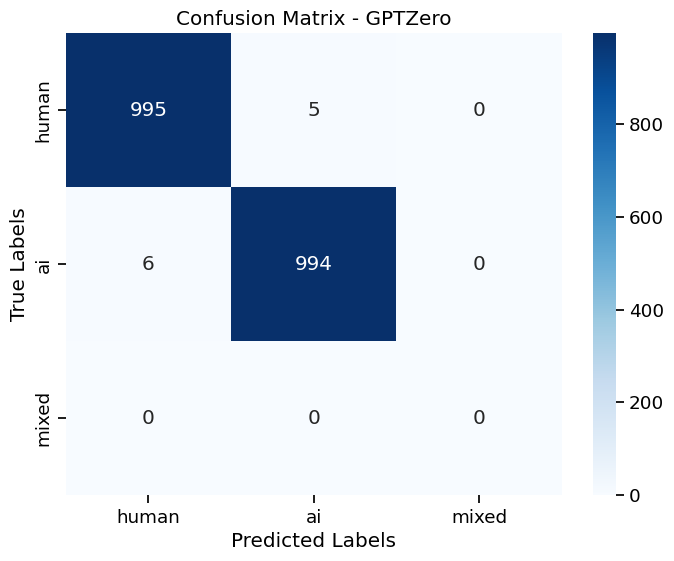 GPTZero had the highest accuracy and lowest instance of confusing AI and human text (0.05%).