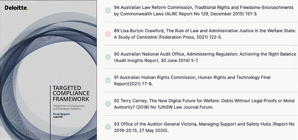 The Deloitte report in question was the result of a $440,000 (AUD) contract between the consulting firm and the Australian Department of Employment and Workplace Relations (DEWR). Published under the title Targeted Compliance Framework: Independent Review Final Report on July 4, 2025 (mirror), it reviewed the department’s system for imposing automated penalties on welfare recipients.