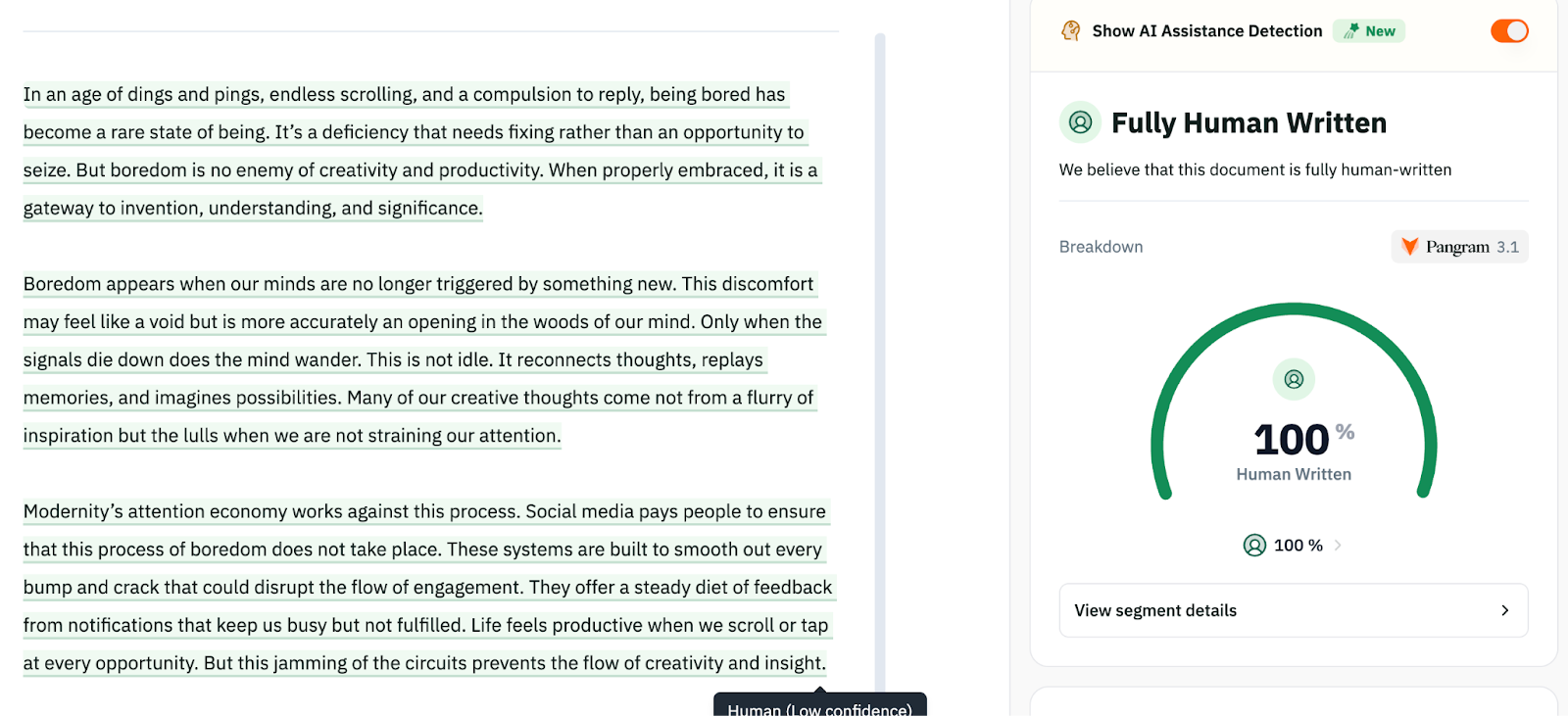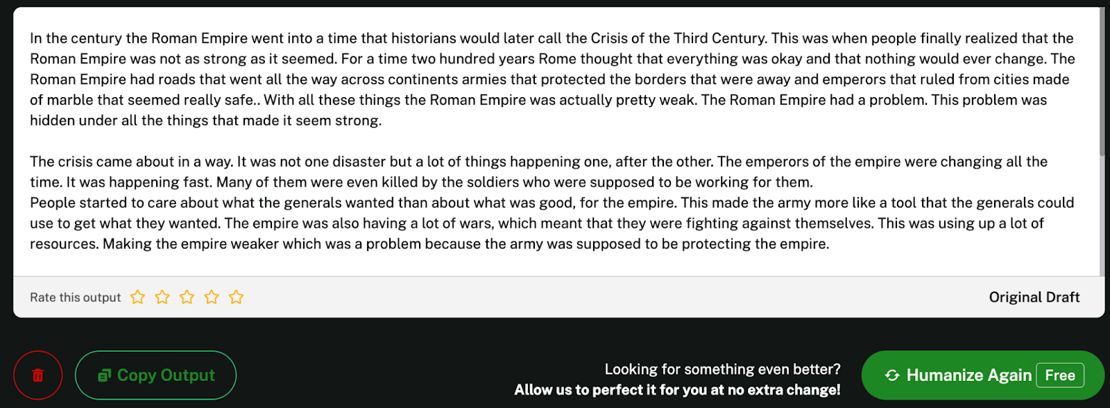 This means someone could take an AI-generated text, put it through a “Humanizer” (a paraphraser), and end up with text that reads differently but is still very much AI-generated.