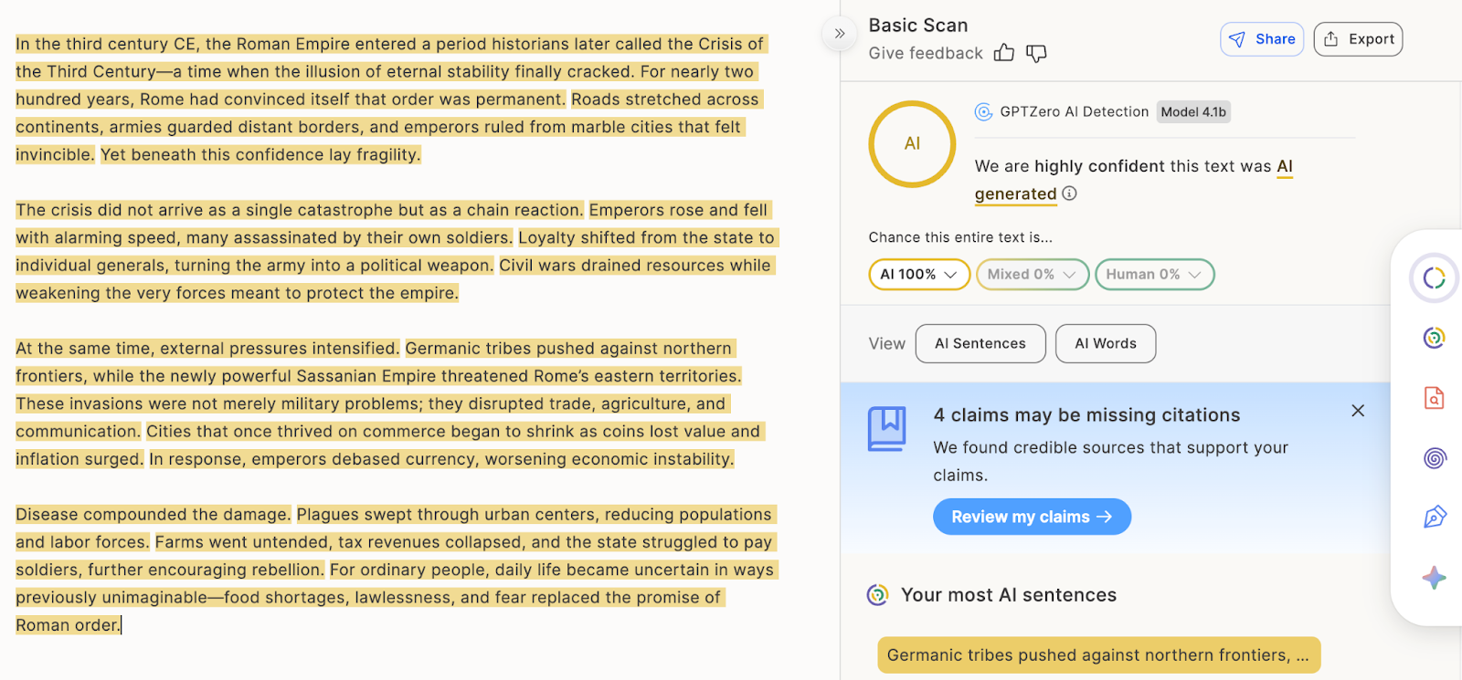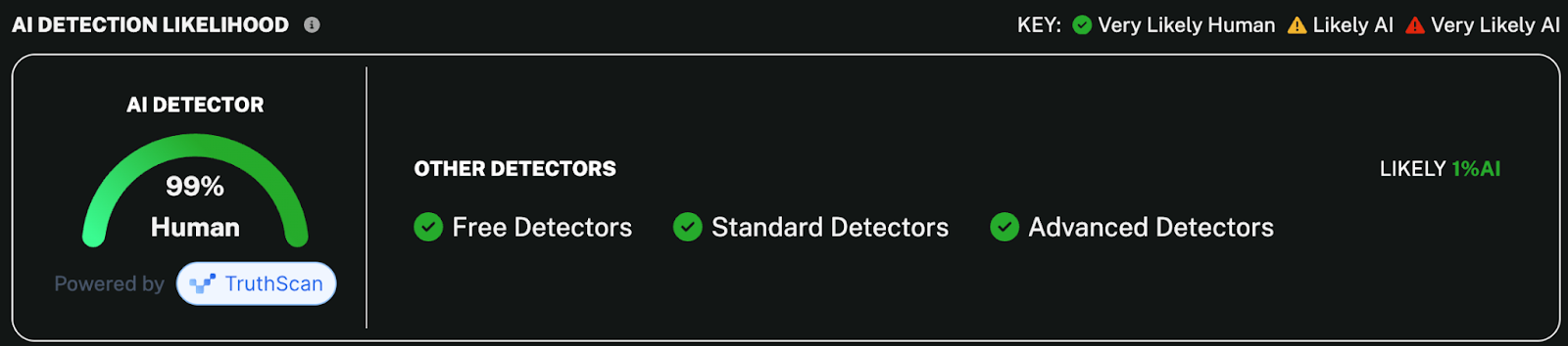 To quantify these results, we evaluated our model against two competing AI detector services (Pangram and Originality.ai).