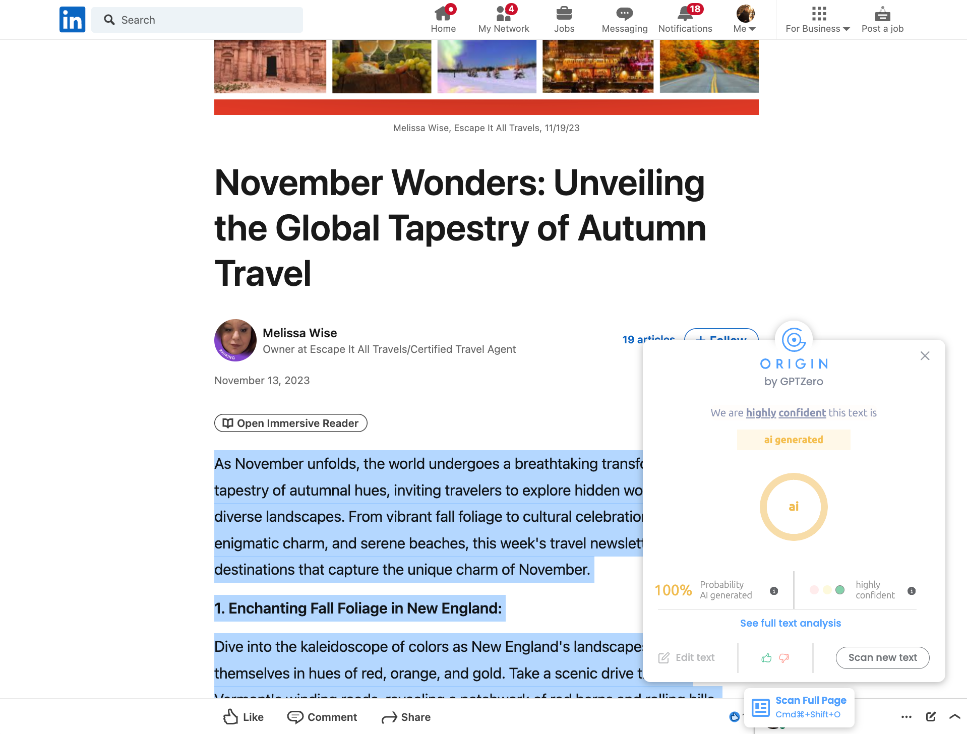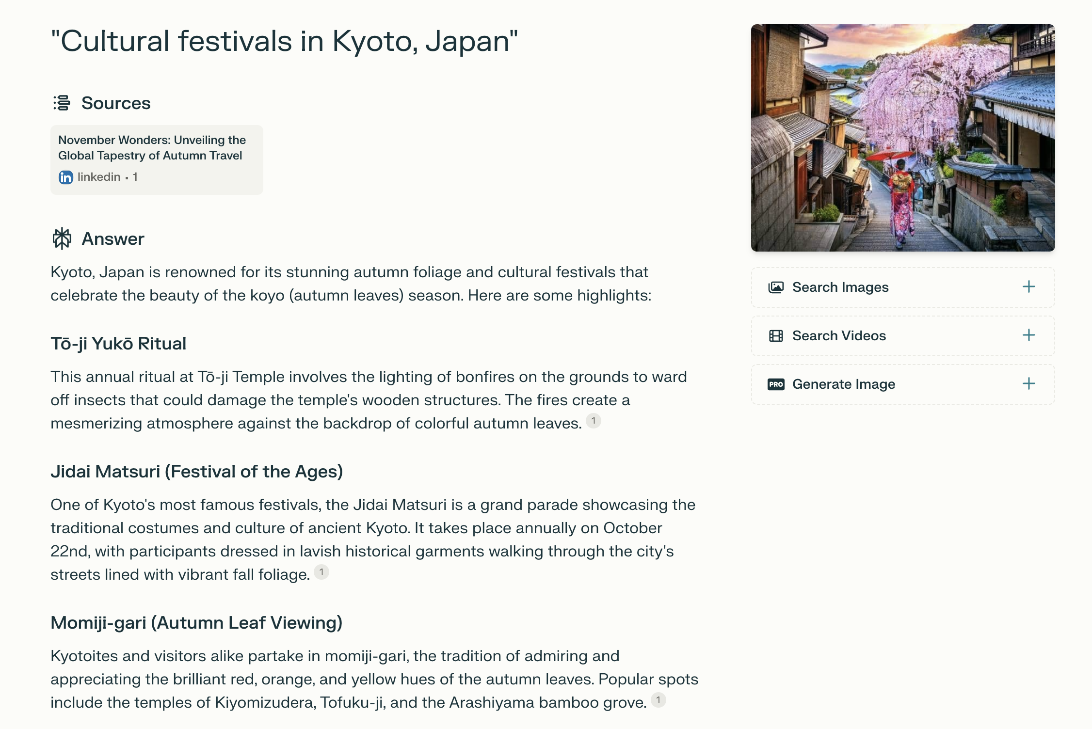 Here's an example of a travel-related search to Japan with the prompt 'Cultural festivals in Kyoto, Japan. ' The only source Perplexity used to generate its response was an entirely AI-generated LinkedIn article.