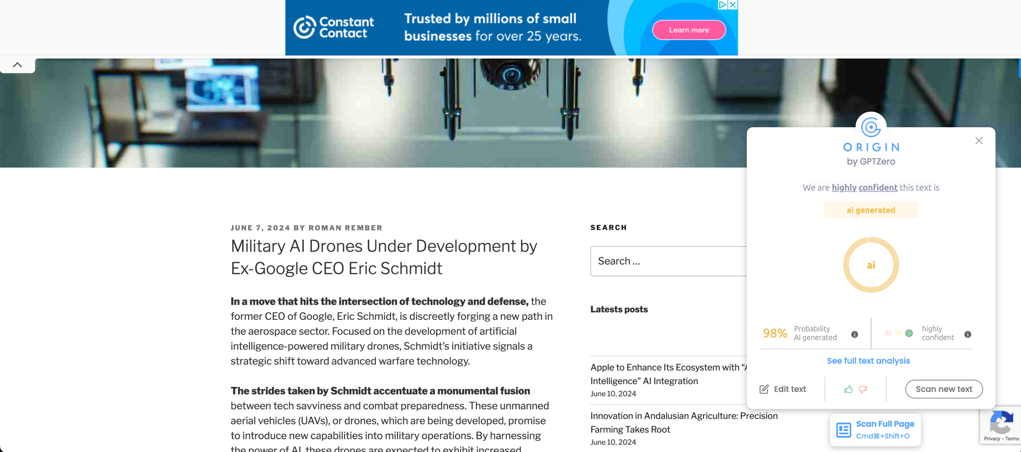 In another example, one of Perplexity's pre-recommended searches for 'Eric Schmidt's AI Drones' directly results in a source that is AI-generated.