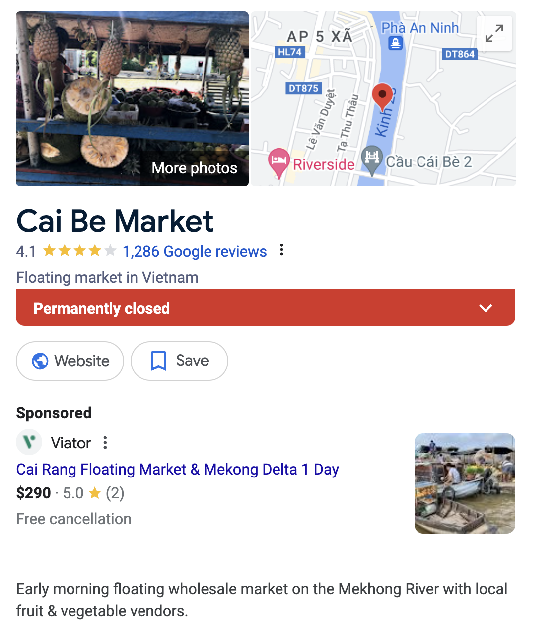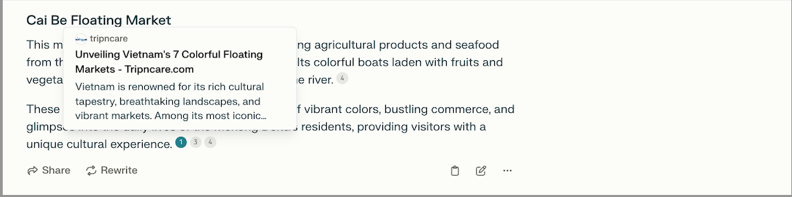 In another travel-related example, a search for Vietnam's famous floating markets on Perplexity returned a result featuring the Cai Be floating markets. Unfortunately, the Cai Be floating market has been permanently closed since the Covid-19 pandemic.