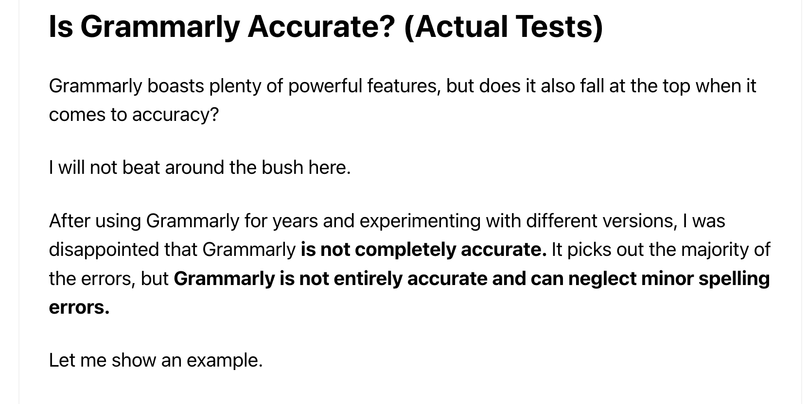 She goes on to say: “I will not beat around the bush here. After using Grammarly for years and experimenting with different versions, I was disappointed that Grammarly is not completely accurate. It picks out the majority of the errors, but Grammarly is not entirely accurate and can neglect minor spelling errors.”