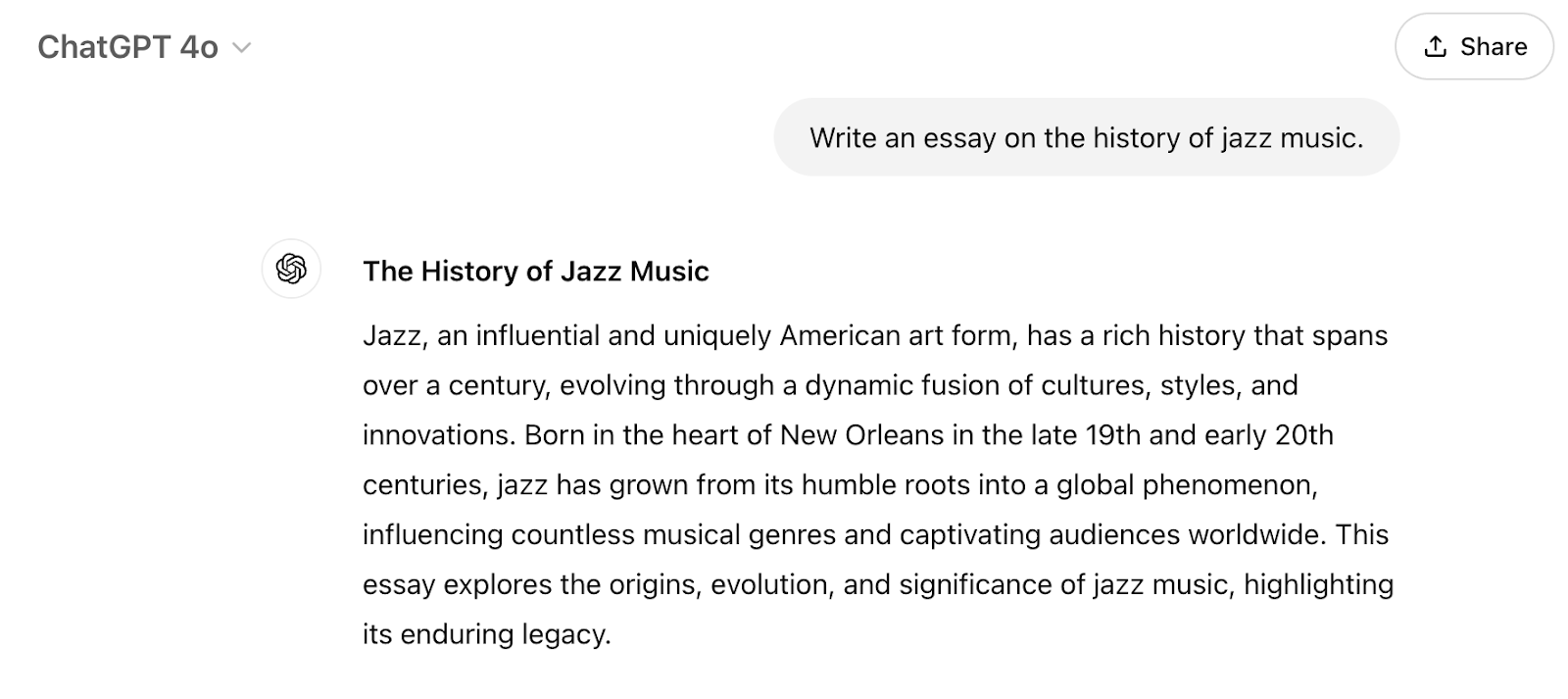 We also ran our own test, and asked ChatGPT to write an essay on the history of jazz music so we could use the opening paragraph. This is what it came up with:
