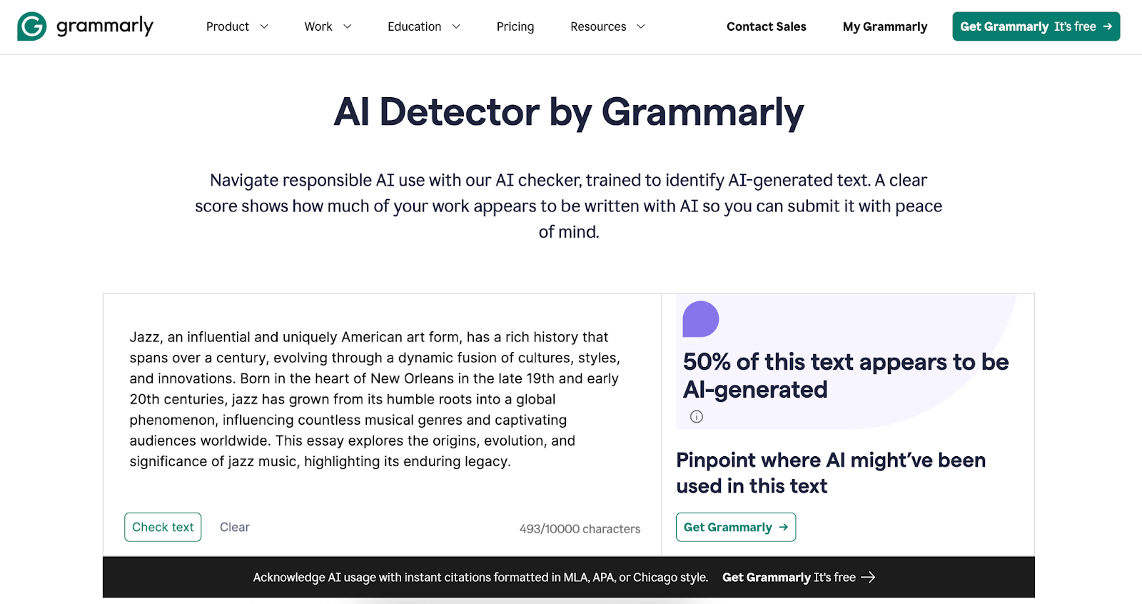 With this in mind, Grammarly draws a distinction between using AI as a writing assistant and submitting fully AI-generated content. Its detector looks for broad signals like repetitive phrasing or unnatural sentence structures, but it’s just not designed to aggressively police AI use or clearly separate human-written text from AI-assisted revisions.