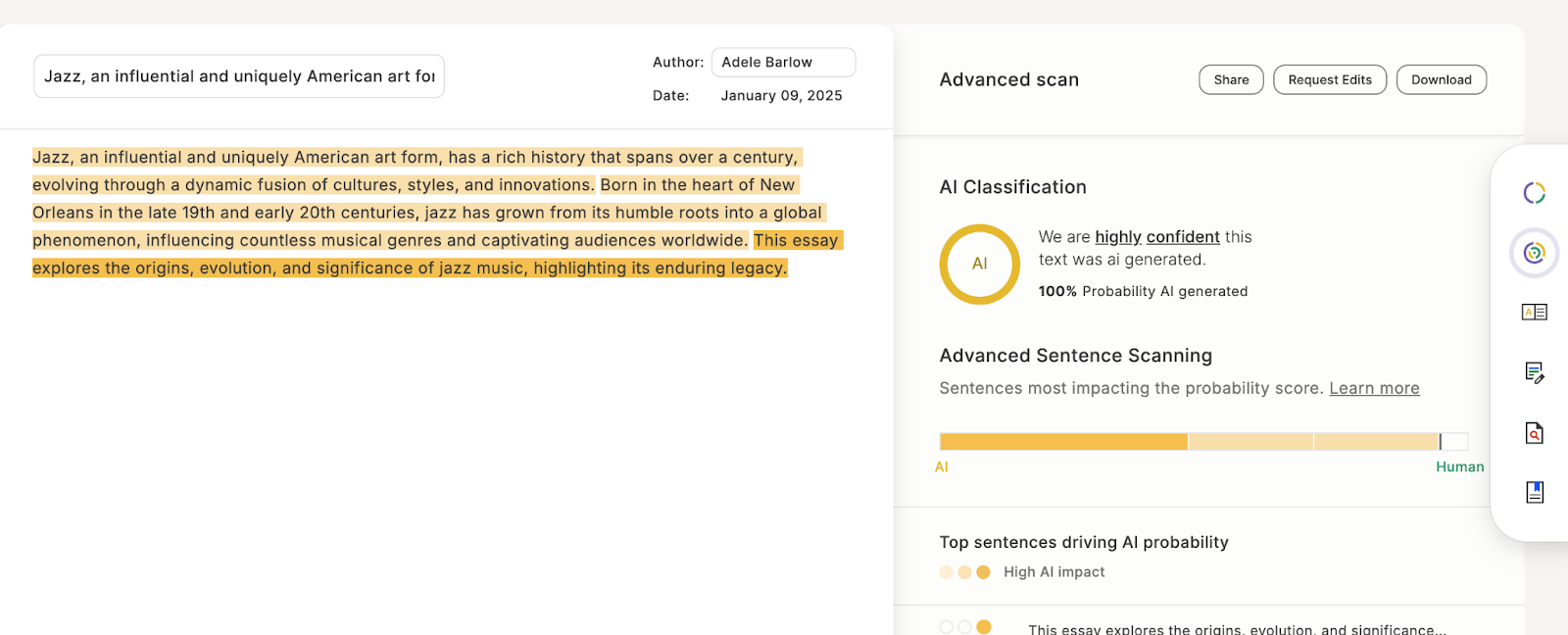 We put this through GPTZero’s advanced scan, which again correctly flagged it with 100% probability of being AI-generated.