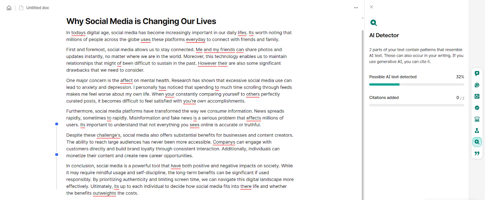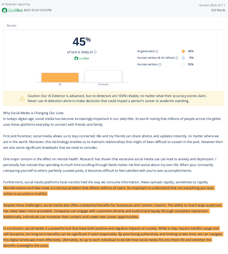 For the next sample, I asked AI to use a mix of causal and AI-ridden language. The AI generated a short essay on “Why Social Media is Changing Our Lives.”