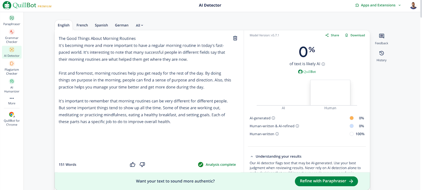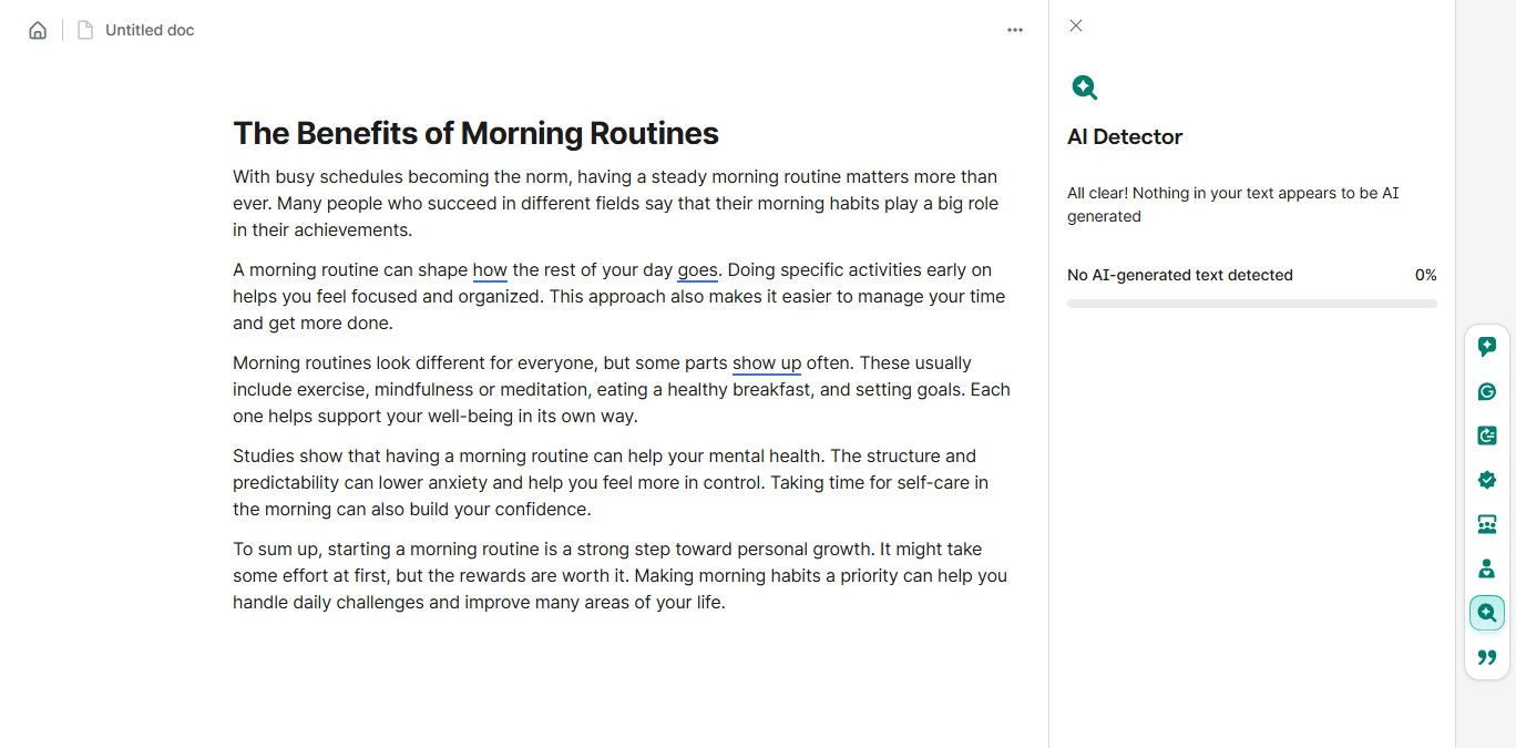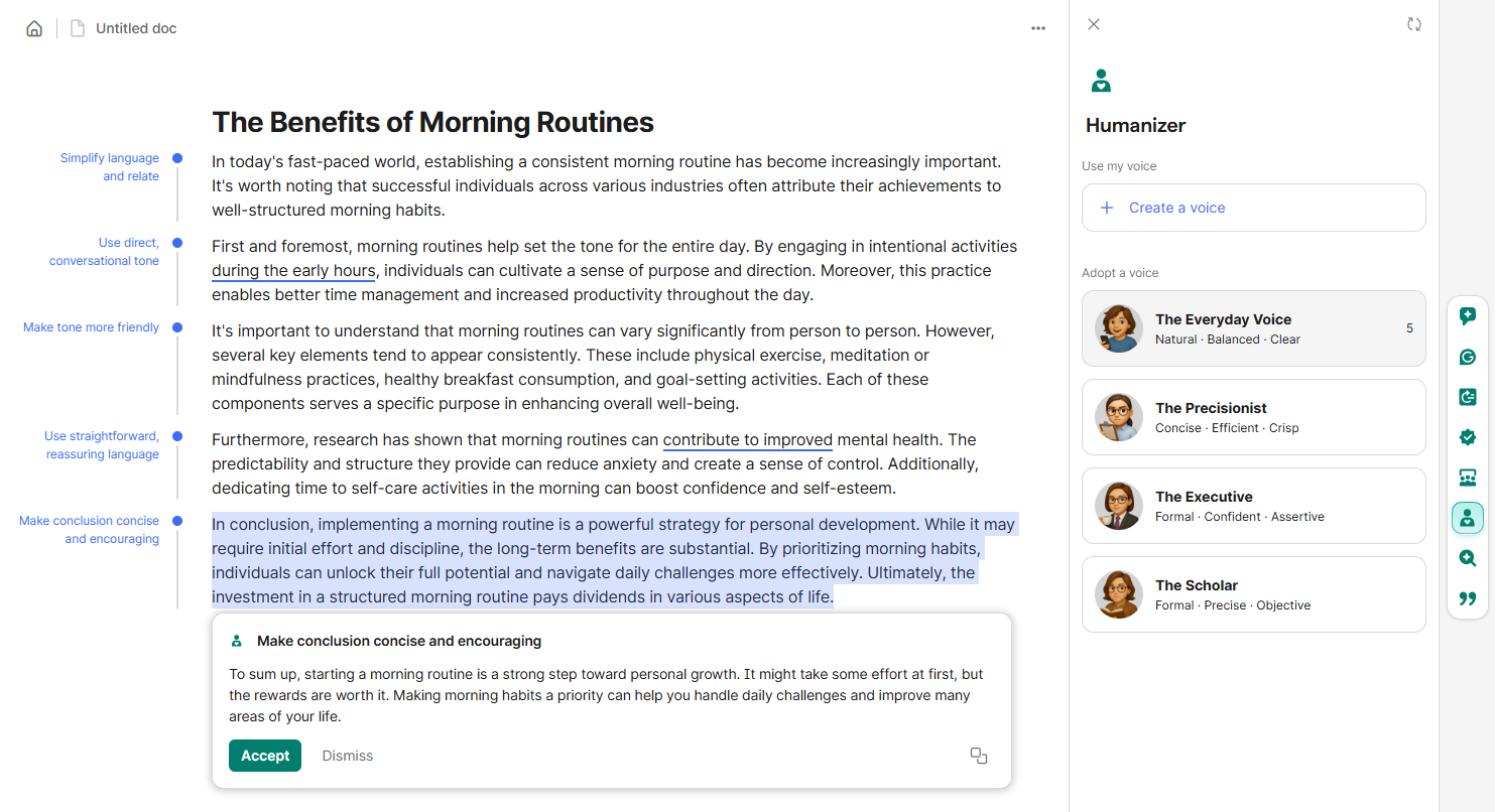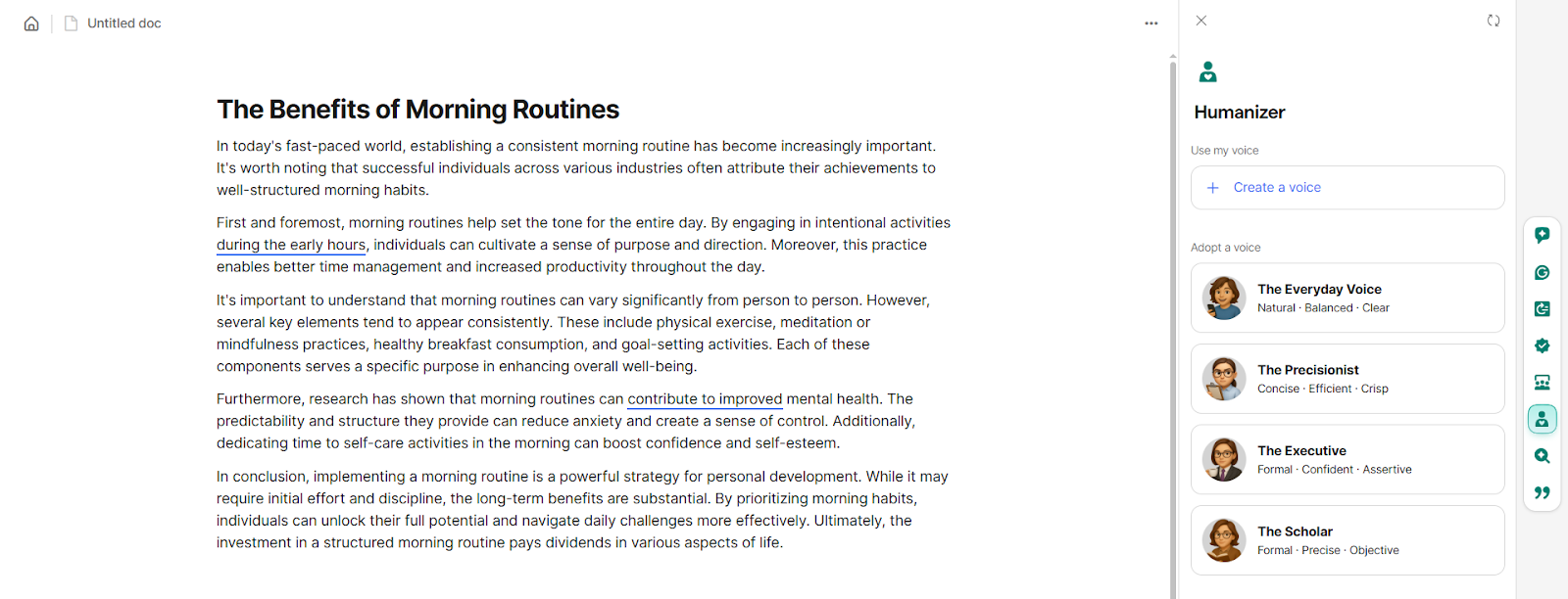 Anyway, I used one of Grammarly’s default voices for the test. The text sample was the same I used for QuillBot, a short 100% AI-written essay on “The Benefits of Morning Routines”.