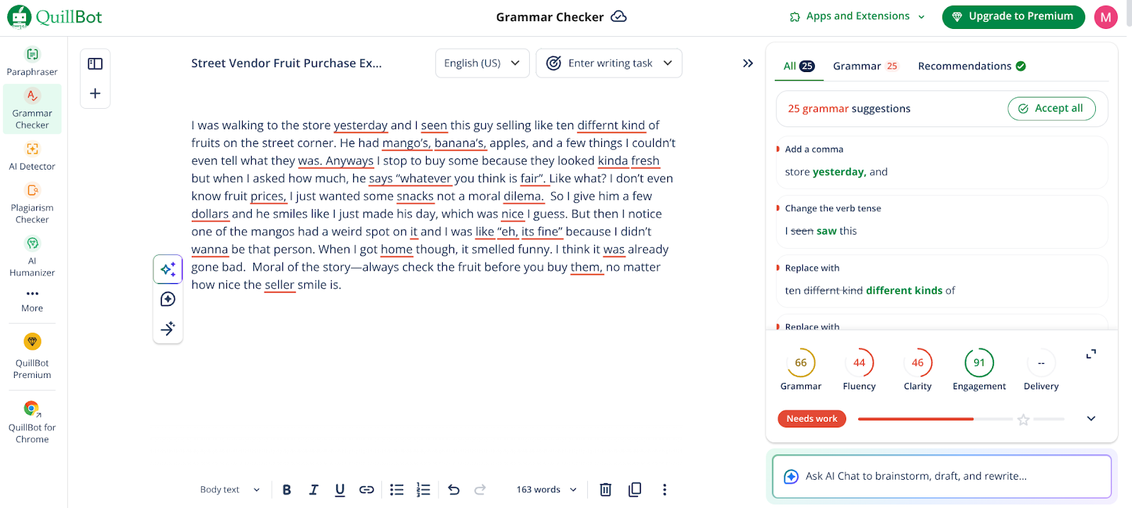 QuillBot found 25 grammar errors while Grammarly detected only 19. Surprisingly, QuillBot’s checking was strict. For example, it didn’t overlook the missing comma after “yesterday” in the first line. Grammarly ignored this.
