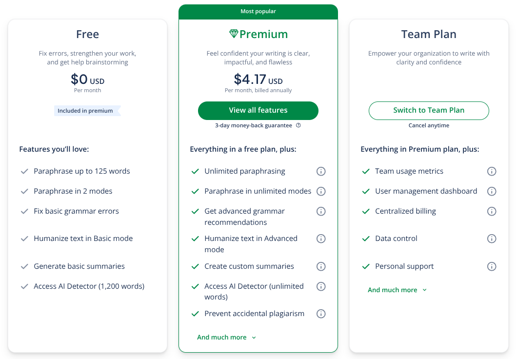 QuillBot’s paid plan is cheaper than Grammarly, costing only $4.17/month on annual billing.