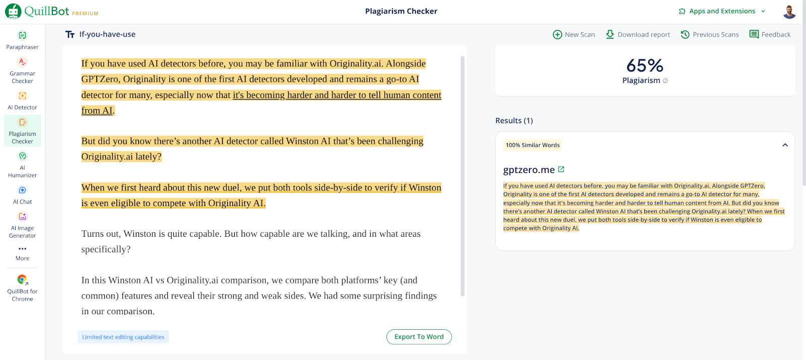 To test how up-to-date and broad QuillBot’s database is, I scanned our article “Winston AI vs Originality.AI,” recently published on Oct 14, too. QuillBot successfully linked it to GPTZero, albeit only 65% of the 100% copied text.