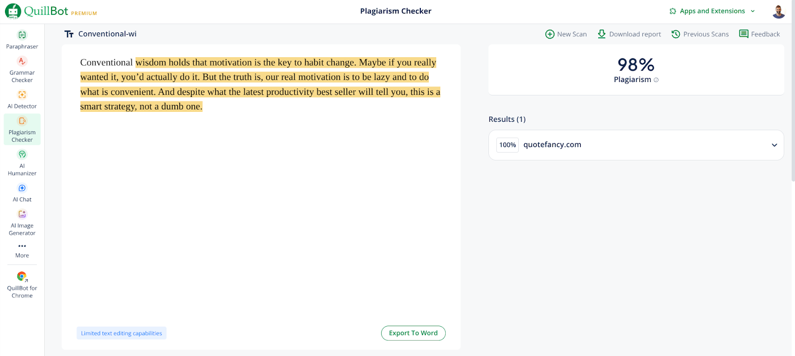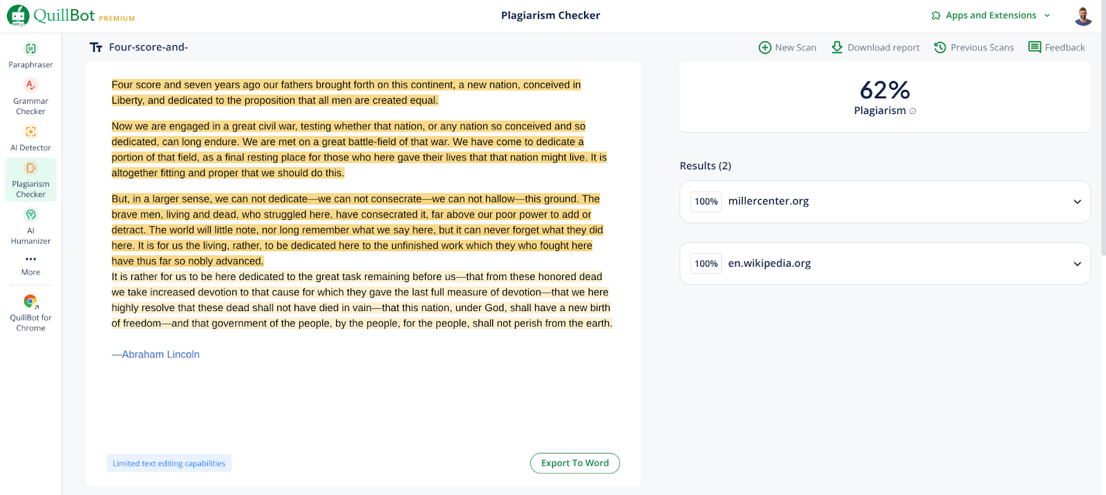 I used some of the same text samples like Abraham Lincoln’s speech and quotes from the Atomic Habits book. QuillBot’s plagiarism results were satisfactory.