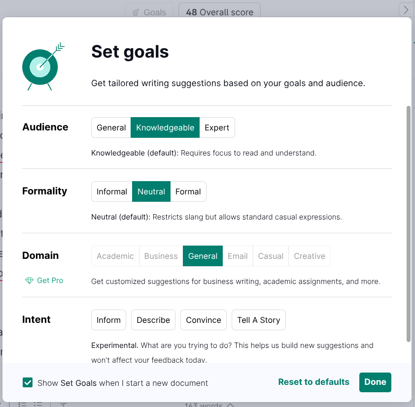 That is due to the grammar checker’s “Goals,” where Grammarly has set “Formality” to “Neutral” by default. When Formality is set to Neutral, Grammarly allows standard casual expressions. You can adjust the goals based on your text’s nature. QuillBot also has a limited version of these settings.