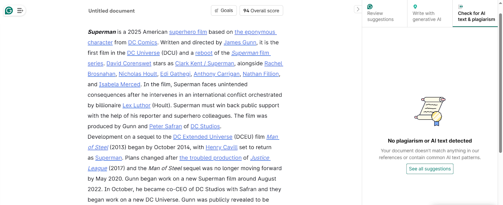 I checked BBC articles, Springer and Harvard studies, old books, new books, old articles, new articles, heck, even Grammarly’s own articles, but Grammarly’s plagiarism checker showed no signs of life.