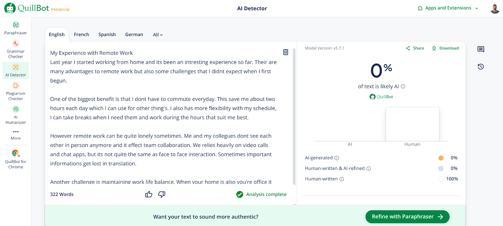 Both QuillBot and Grammarly AI failed to detect that it was AI-written. They both gave it a 0% AI score.