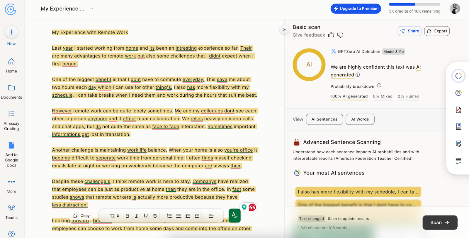 Now, I gave the same AI generated text to GPTZero’s AI detector (the leading AI detector) and it correctly flagged the whole content as AI written. You can clearly see the difference in quality: