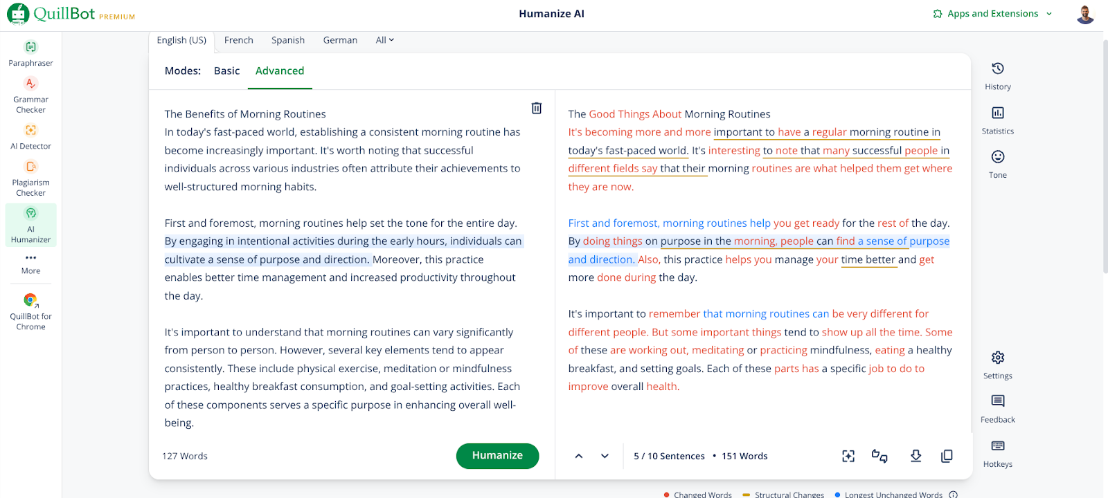 Anyway, I used one of Grammarly’s default voices for the test. The text sample was the same I used for QuillBot, a short 100% AI-written essay on “The Benefits of Morning Routines”.