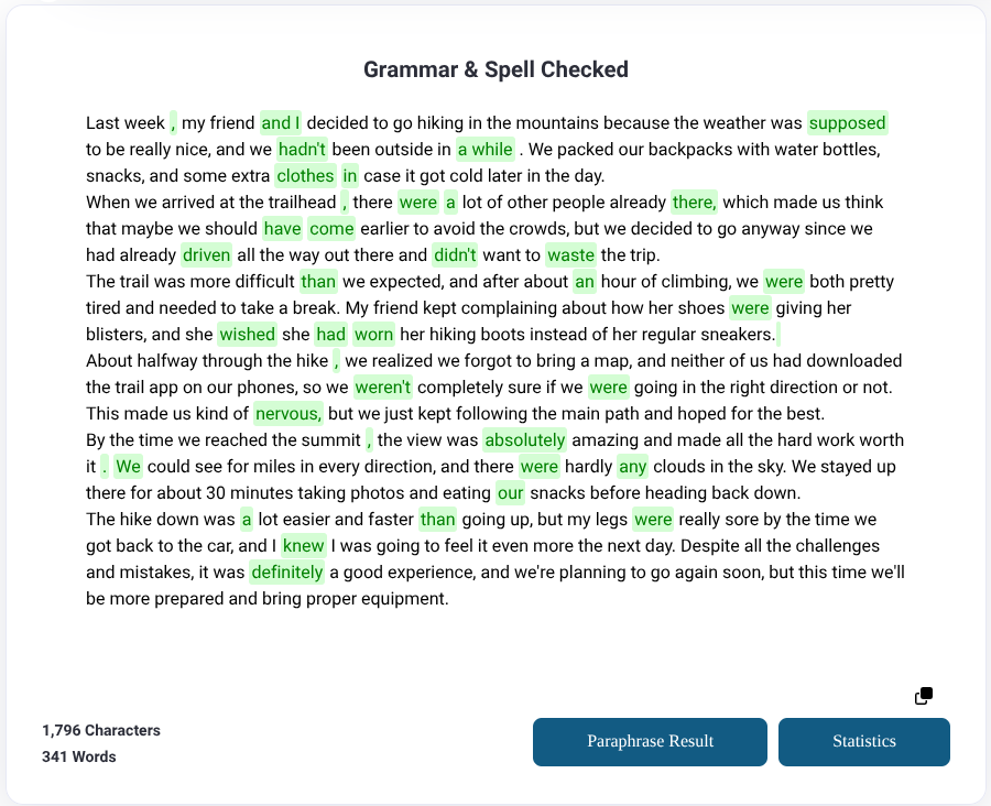 However, if you cross-check the edited text with the original text, there are some changes that ZeroGPT hasn’t highlighted. For instance, ZeroGPT added many commas that it didn’t highlight. Also notice how it corrected “...since we already…” to “...since we had already…” without highlighting the had.