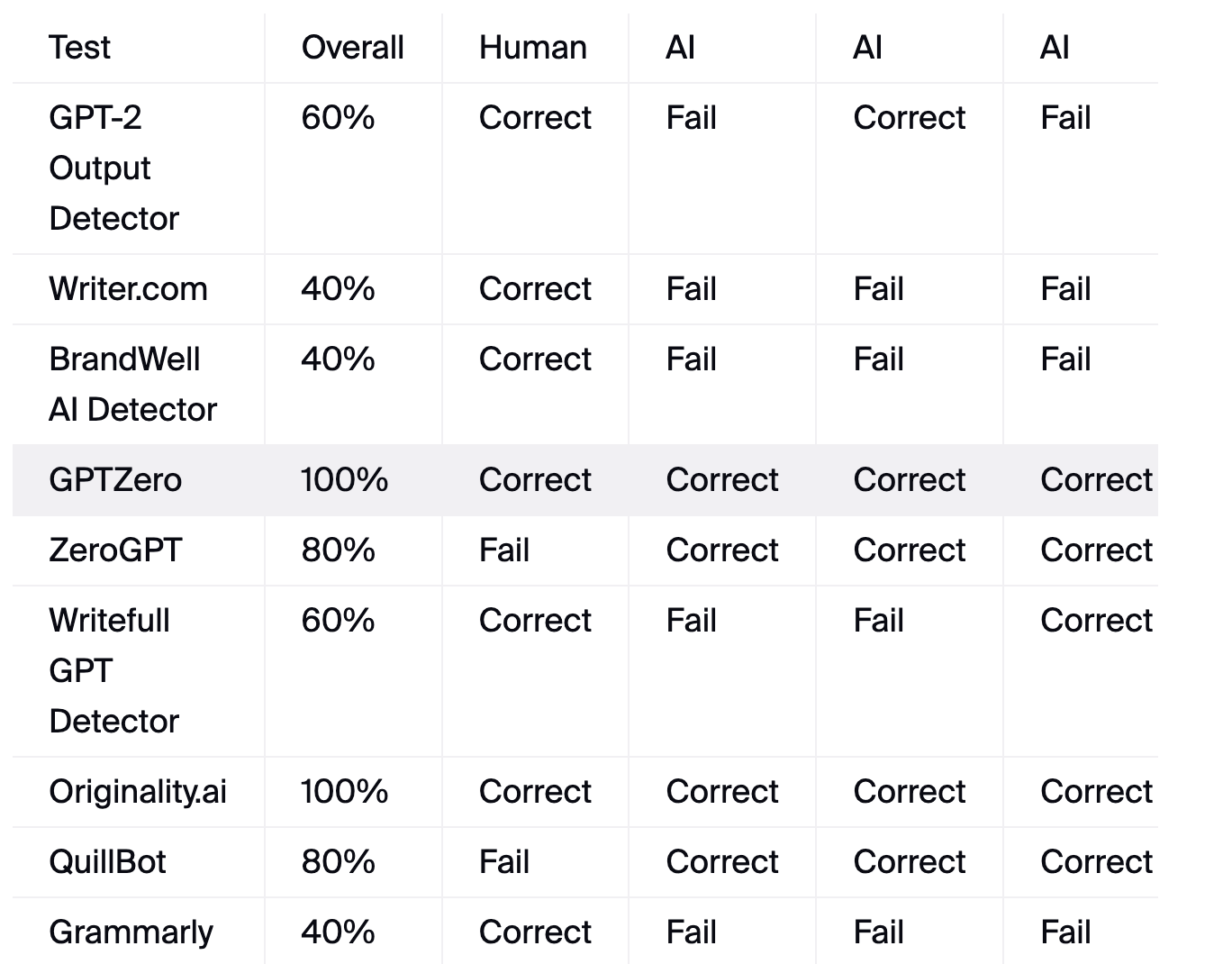 Test Results of AI Detection Accuracy