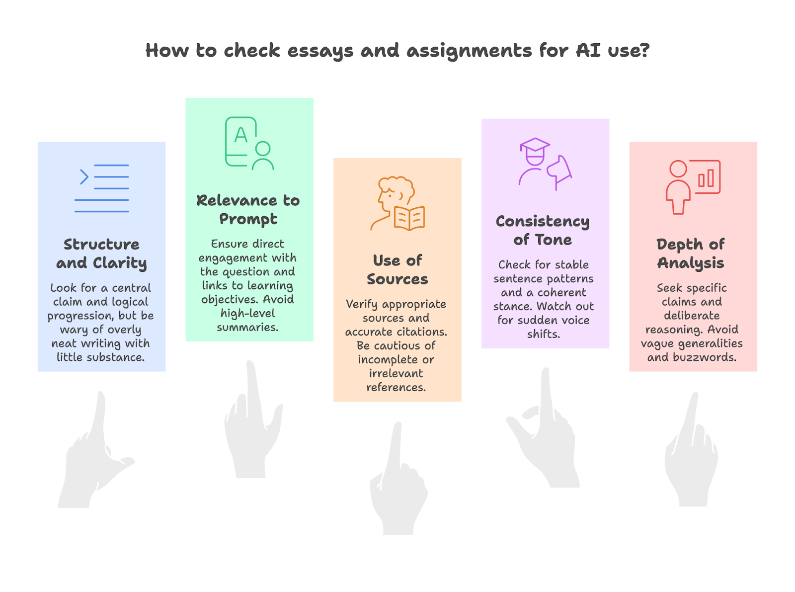 Start by checking, has the student actually answered the question that was asked? This firmly bases your review in academic standards rather than suspicion, and gives you a firm framework for how to check essays even when writing styles vary.