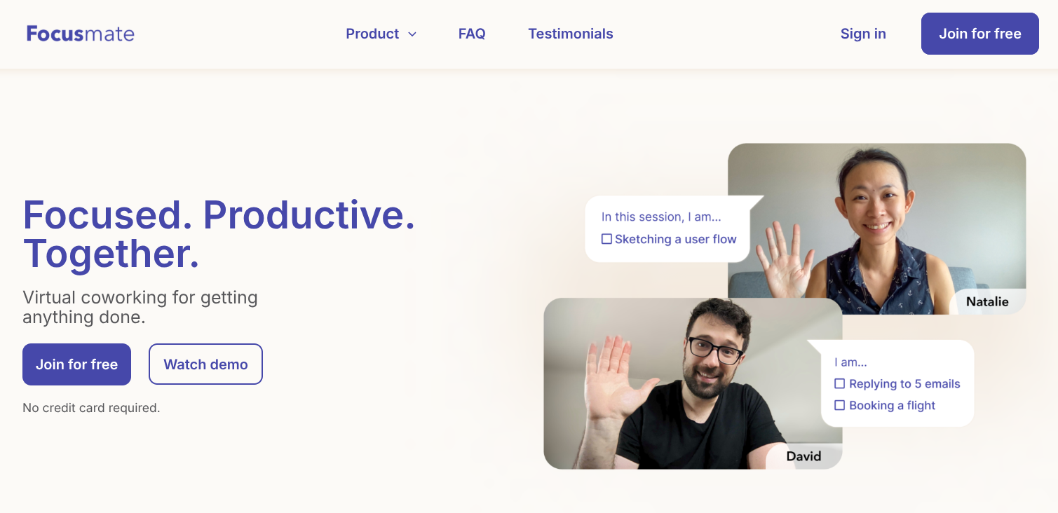Focusmate is a productivity cheat code. It pairs you with a real human (a stranger) for 25, 50, and 75-minute virtual co-working sessions.