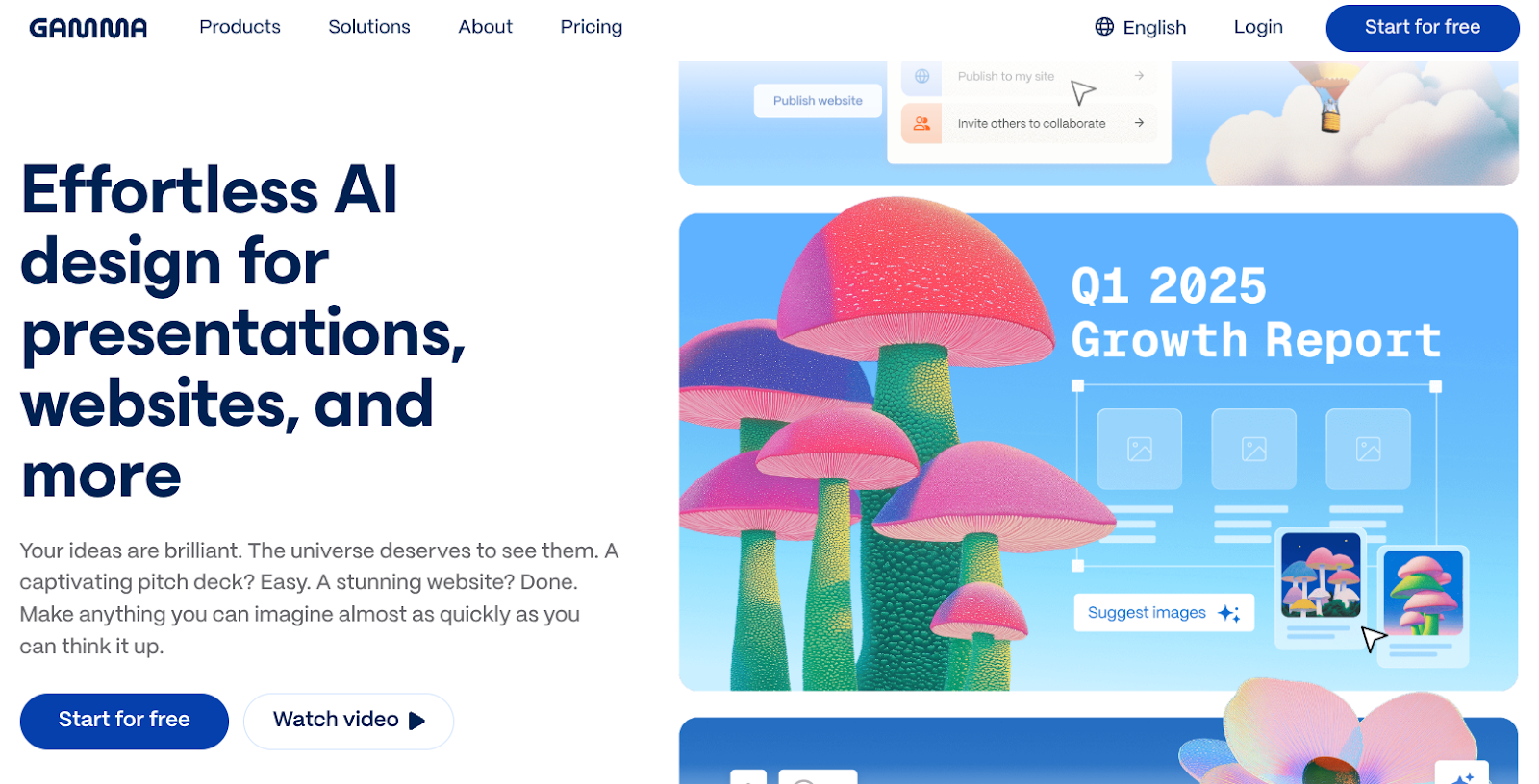 Gamma builds presentations, documents, web pages, and social media graphics in minutes using AI.