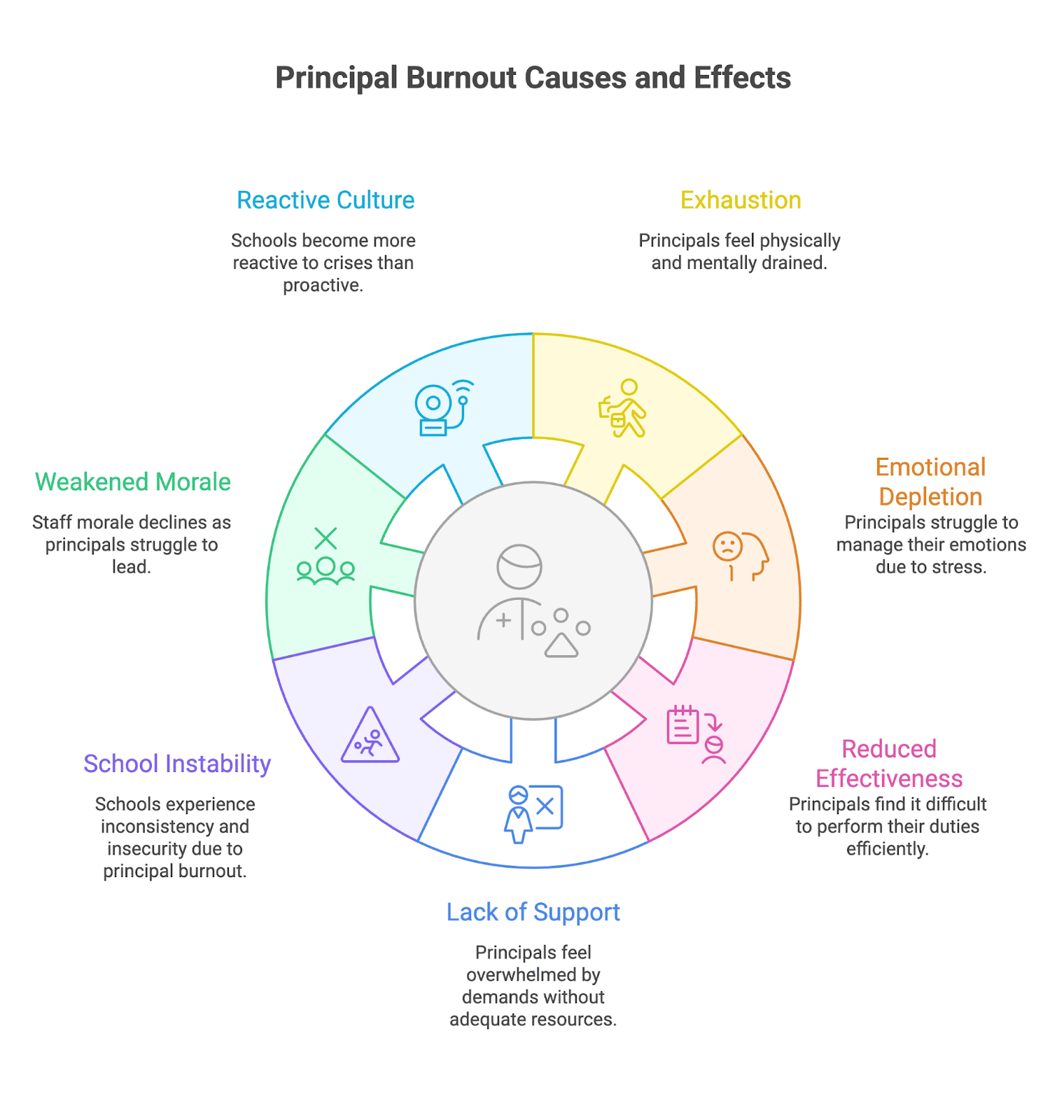 When principals burn out, schools lose consistency, decision-making capacity, and strategic focus; while staff morale can weaken, and school culture can become more reactive. There’s likely to be more instability and insecurity, which doesn’t tend to create an environment where staff and students can do their best work.
