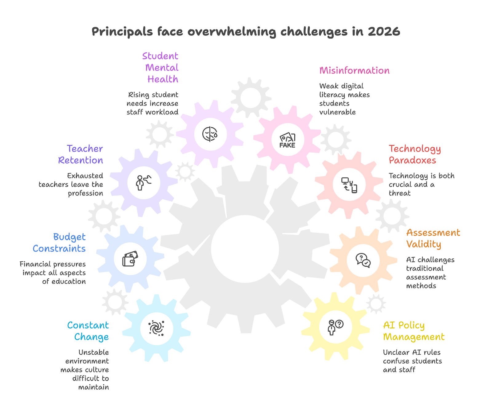 The biggest challenges principals face in 2026 are far from isolated issues, and instead are connected pressures that affect how schools function every day: AI policy, assessment design, staffing, wellbeing, budgets, and school culture all shape one another.