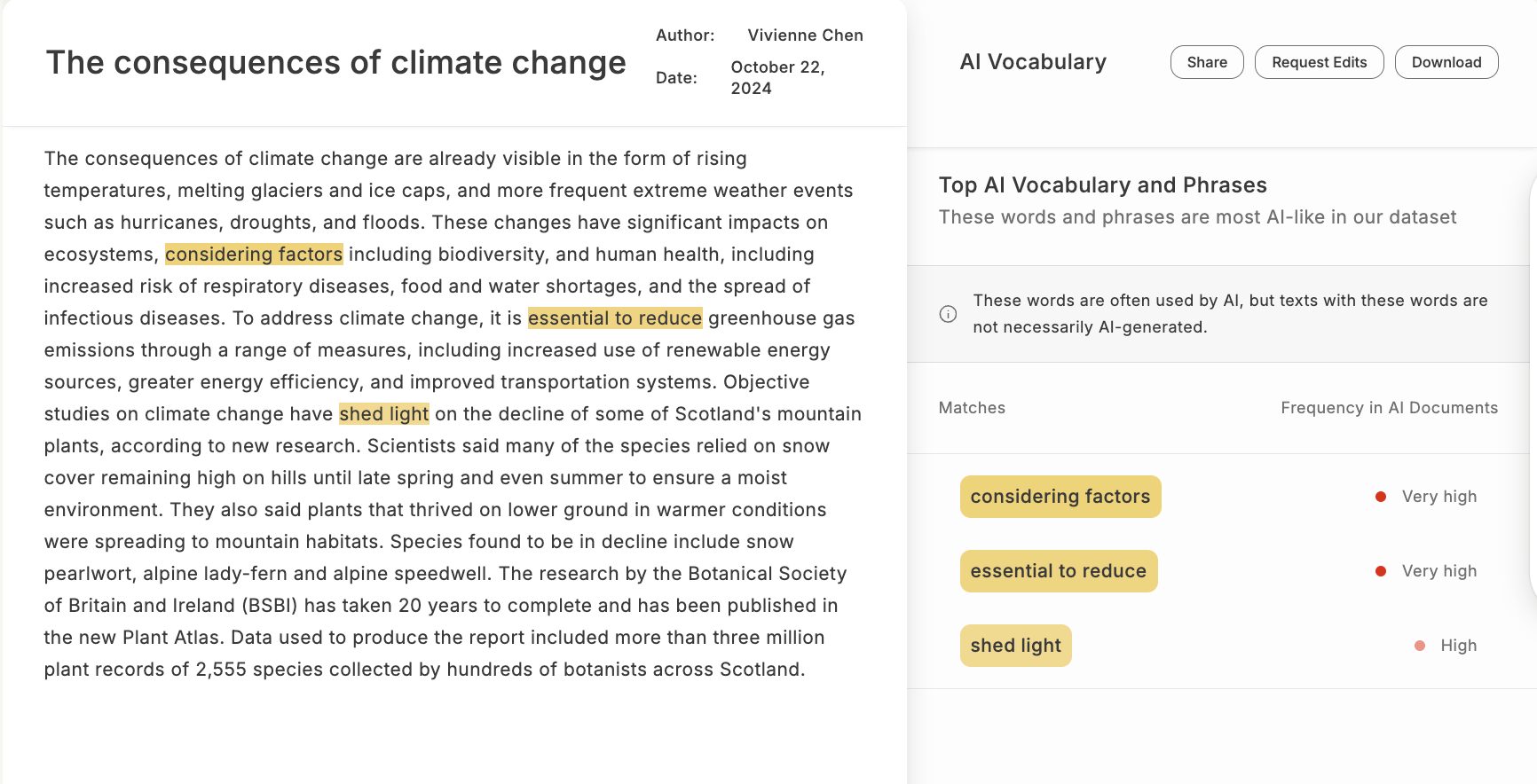 Notice how "shed light" shows up in a human-highlighted passage as a common AI word.