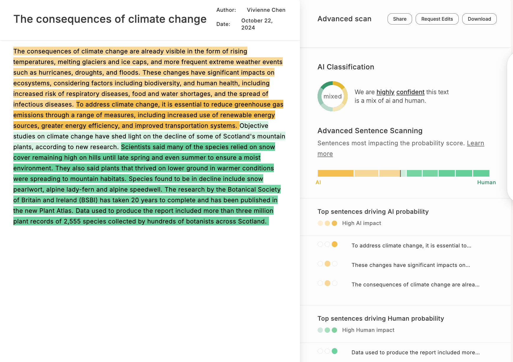 GPTZero Quick AI Scan comes with a categorization of “AI”, “human,” or “mixed” (both AI and human). Each result includes two parts: an AI probability score and a “confidence” statement. With GPTZero Advanced scan, you get more granular, sentence level highlighted detail on which sections are contributing most to your AI/human score.