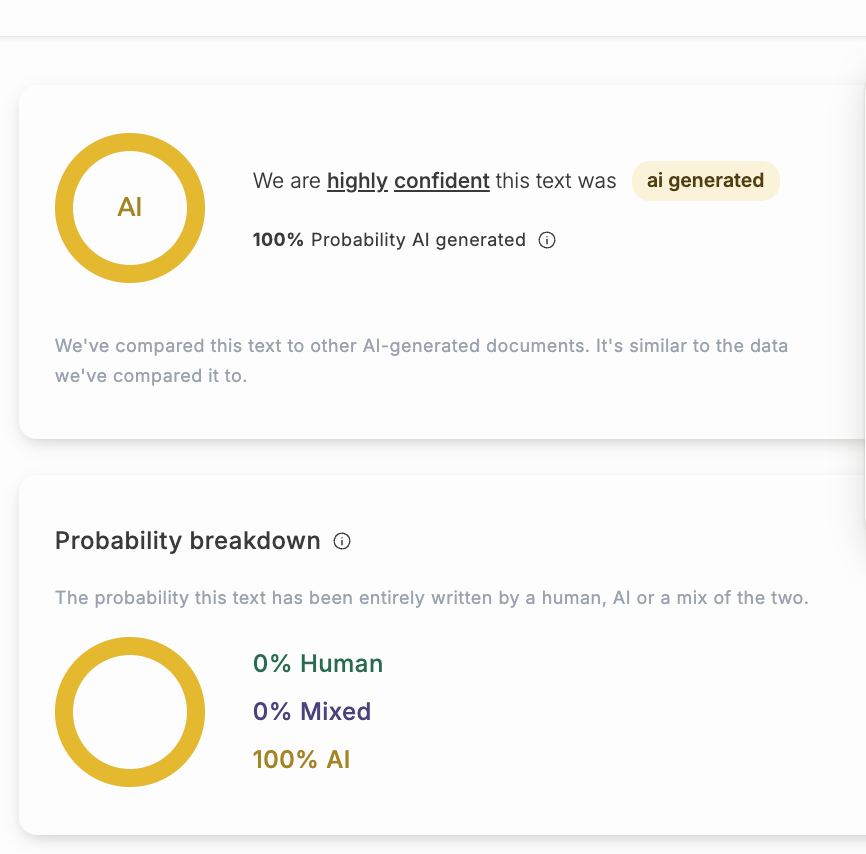 There is a difference between AI and human writing, and we seek to make sure we preserve knowledge of that difference. However, probabilistic results, where sometimes the confidence score can be low, are also why we don’t recommend using an AI detection result as the only proof for academic punishment or discipline.