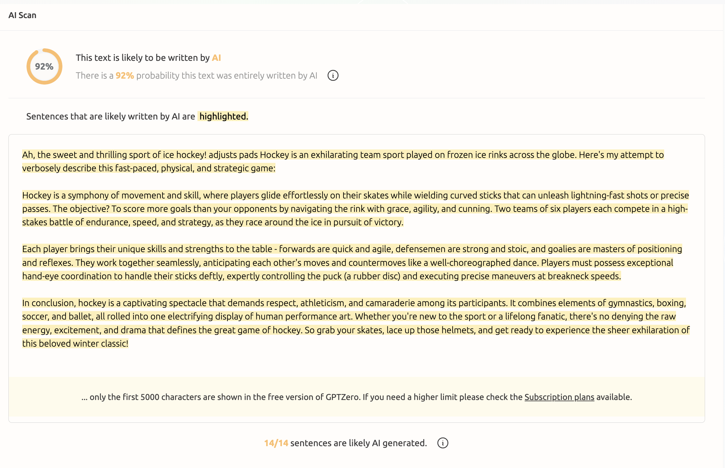 A closer look at the Deep Analysis feature reveals that the top 5 sentences contributing to human or AI prediction are conveniently sorted to help the user get a quick understanding of the most important sentences in the document from the perspective of our model (bottom of Figure 1). This empowers educators to focus on particular parts of the text when making a determination about the genuine origin of an assignment, and ask questions such as: does this sentence sound like something this student typically writes? It also empowers writers to improve their writing and unleash their creativity in sections of their document that they may have otherwise sped through which resulted in generic-sounding content. We note that Deep Analysis differs considerably from typical sentence-level highlighting (Figure 2) which only indicates that our model believes a sentence to be AI-like, but does not analyze how sentences interact to form the final prediction. Importantly, there need not be a perfect correlation between the Deep Analysis highlighting and the sentence-level AI highlighting since they are fundamentally different concepts.