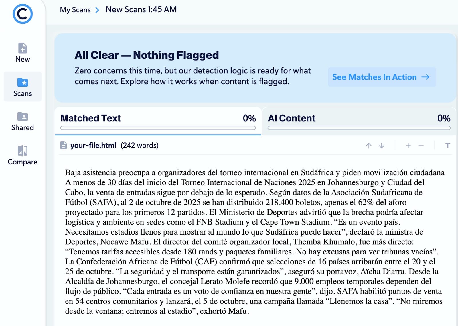 We also carried out a qualitative review of representative samples across languages where we captured classification differences directly from all detector’ dashboards. The examples below (Fig. 1-3) show typical misclassification errors observed in competing models (FPs for Originality and FNs for Pangram and Copyleaks) and how GPTZero got it right.