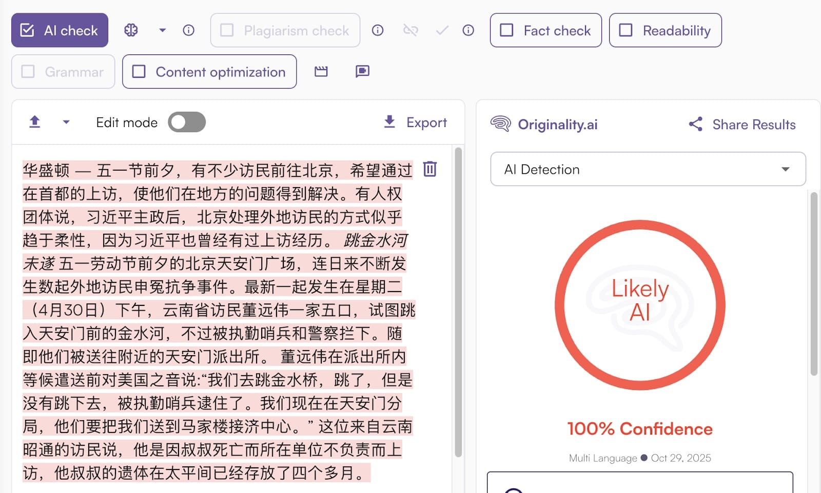 This is the most accurate multilingual AI detector we’ve ever built. We have upgraded our model architecture to a larger, more enhanced version capable of identifying language-specific linguistic and stylistic nuances more effectively – in both Human and AI writing, allowing us to achieve exceptionally low false positive rates of <0.5% while improving our AI recall to ~99%.