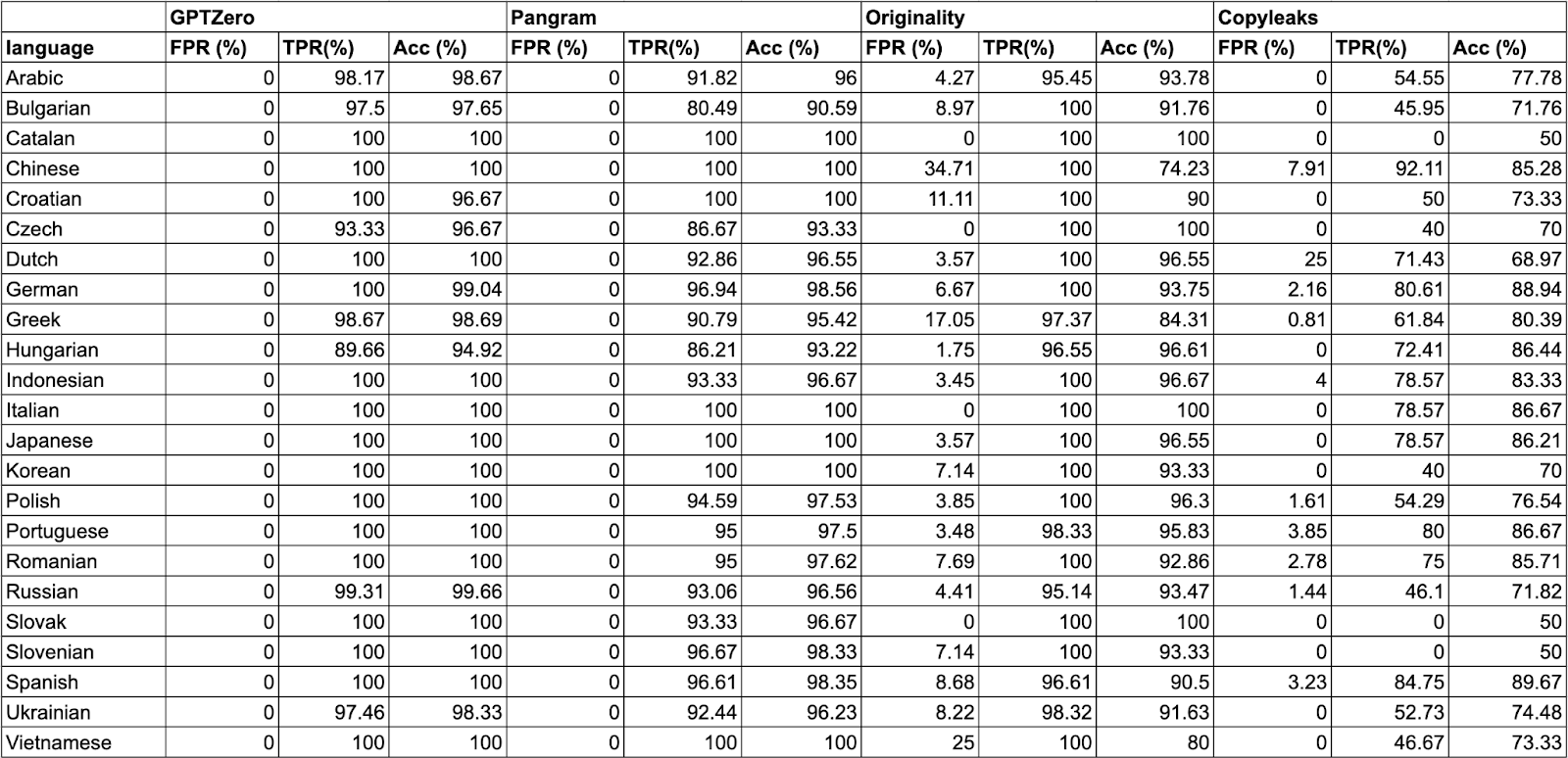 Table 2: GPTZero benchmarked against major competitors Copyleaks, Originality and Pangram on our multilingual benchmarking test set.
