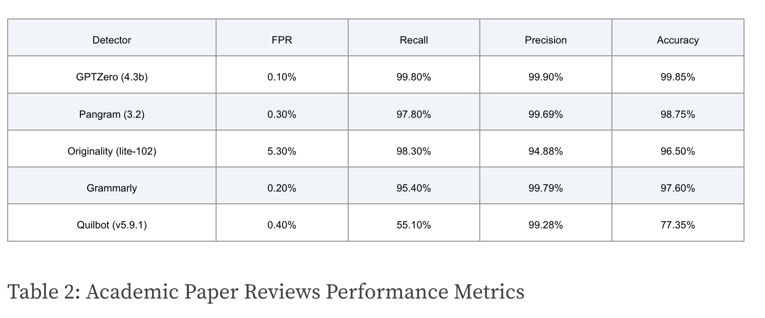 The results show that GPTZero’s detector is the most accurate solution available. A false Positive (FP) is a human text incorrectly predicted as AI, and the False Positive Rate (FPR) is the percentage of human texts misclassified as AI. When it comes to Academic Paper Reviews, we’re proud to have the lowest FPR among competitors, which you can see from Table 2.