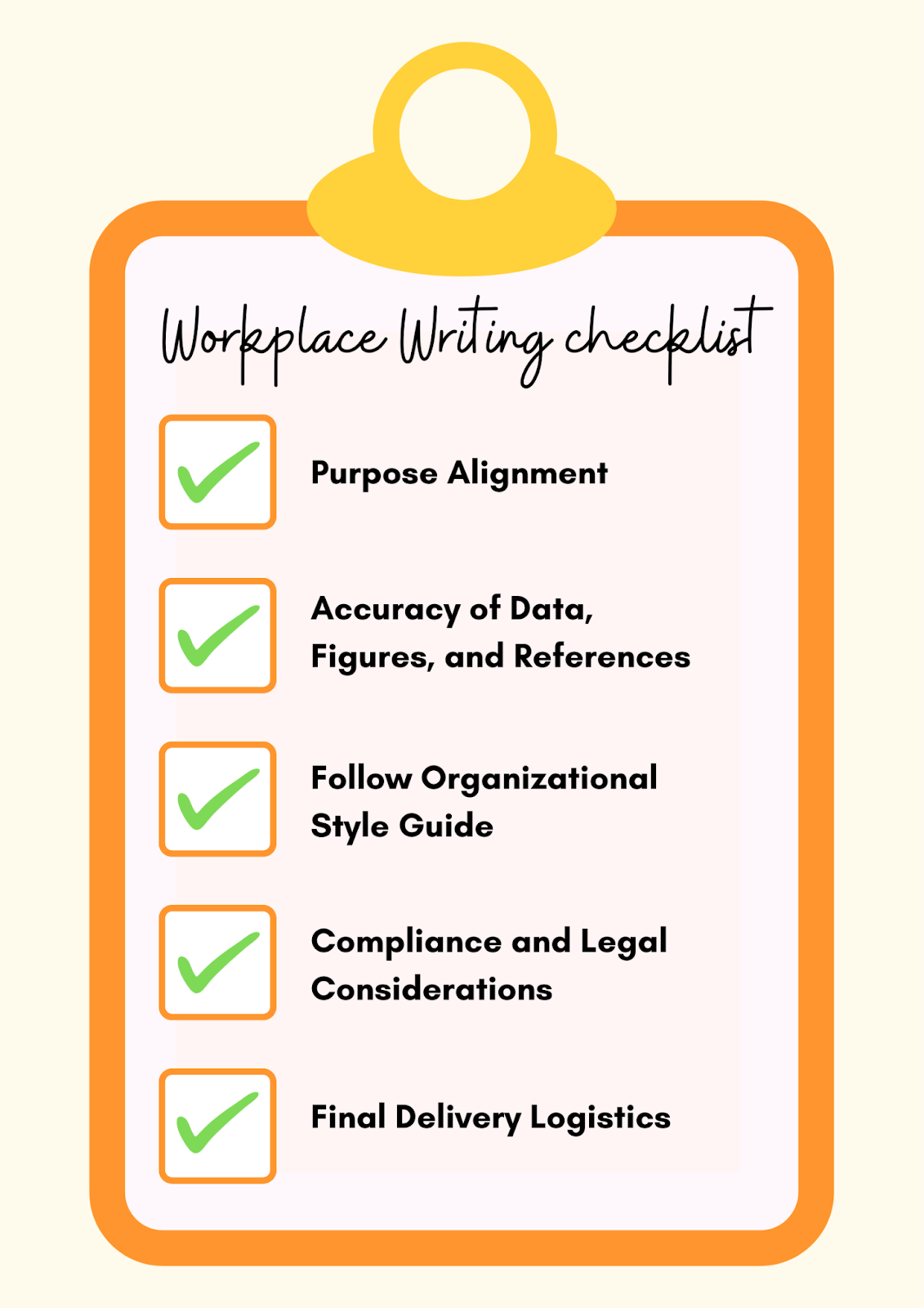 Lastly, your workplace writing checklist should also make sure the right document gets to the right people in the right format at the right time.