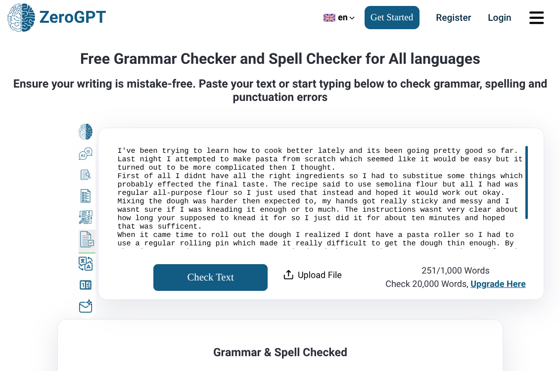 Then I gave the same text to ZeroGPT’s grammar checker. ZeroGPT’s interface is simple and old-fashioned. You just paste your text or upload a file and press a button. The free version allows 1000-word scans.