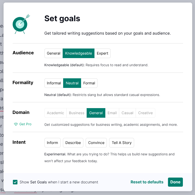 When I entered the text into Grammarly, it asked me to set writing goals for the desired level of suggestions. This is Grammarly’s way of gauging context to detect only the appropriate mistakes.