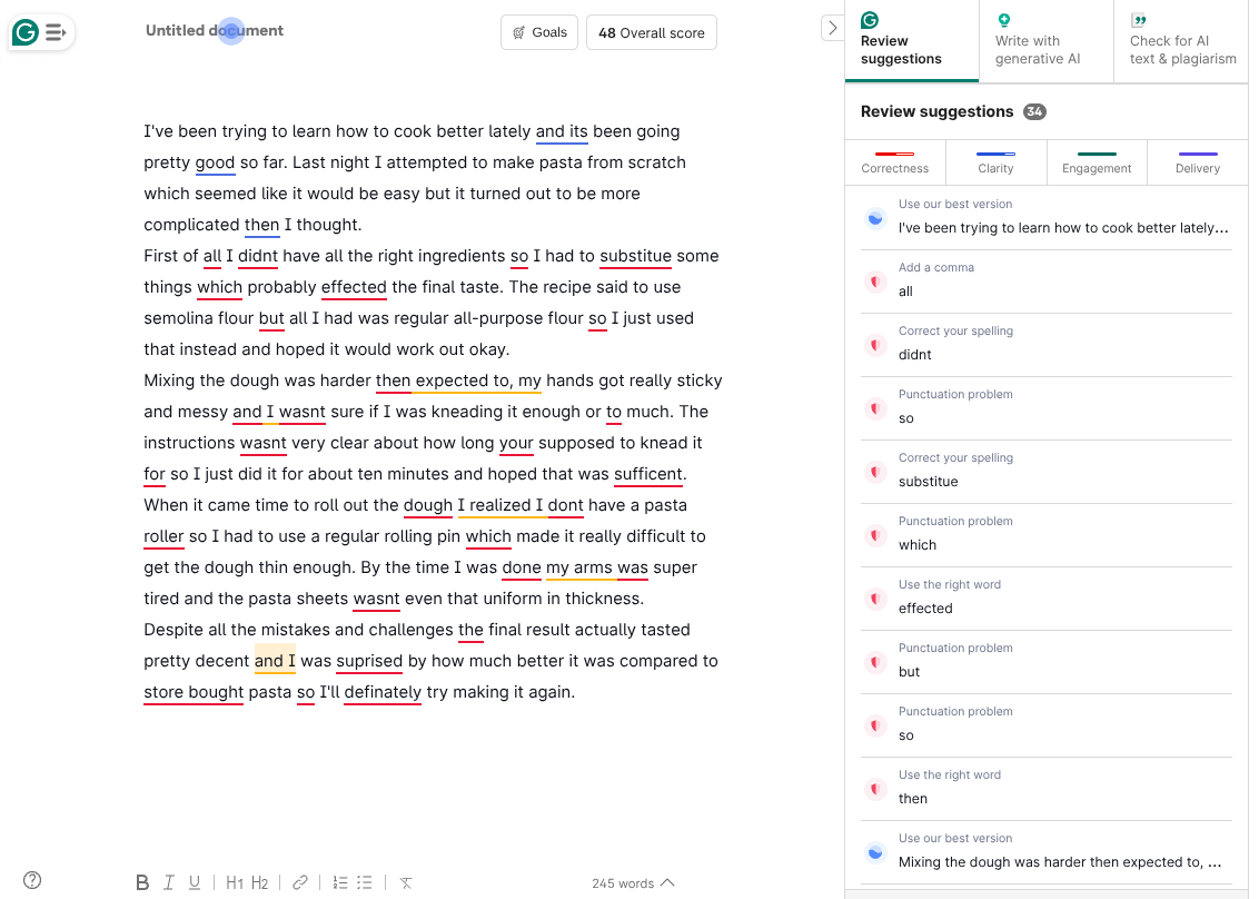 Grammarly was able to point out all the issues in the text. It suggested edits for grammar, misspellings, and punctuation.