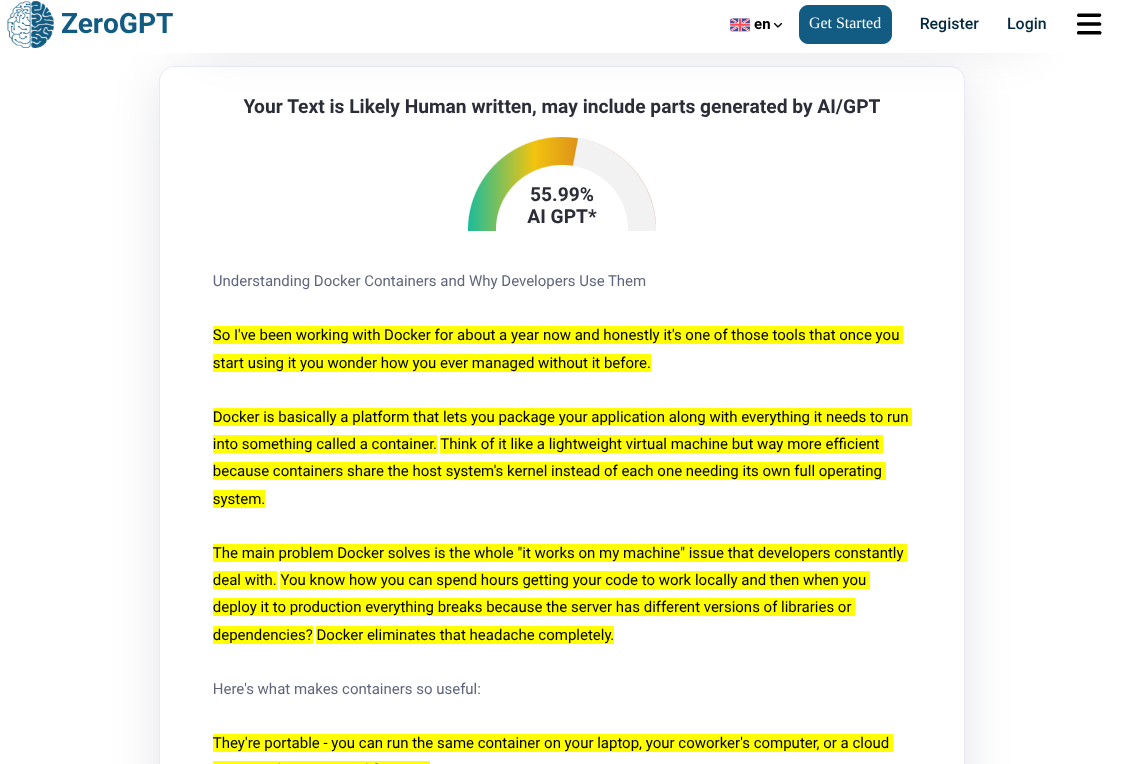 ZeroGPT’s final answer was that the text is likely human-written with AI-generated parts. It could only detect 55.99% of the text as AI, which is far from an acceptable level of accuracy.