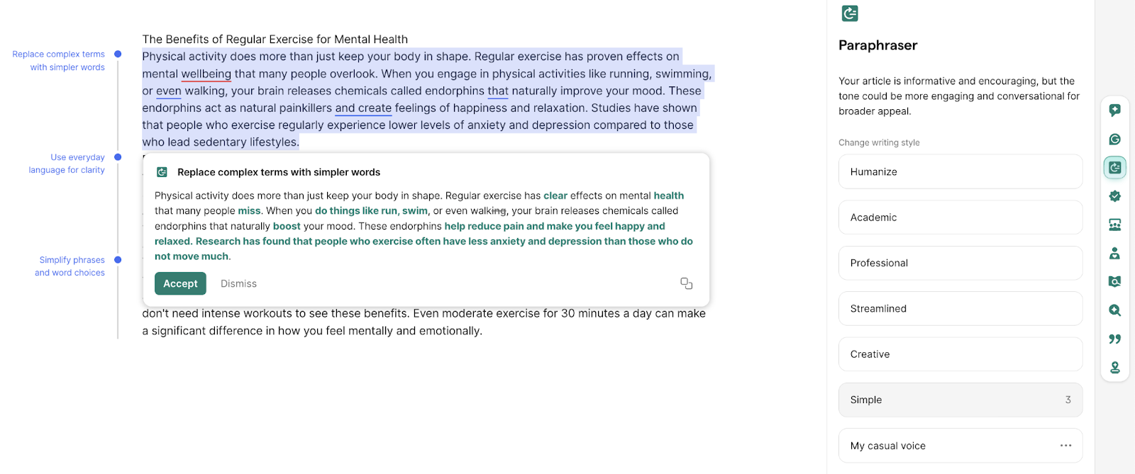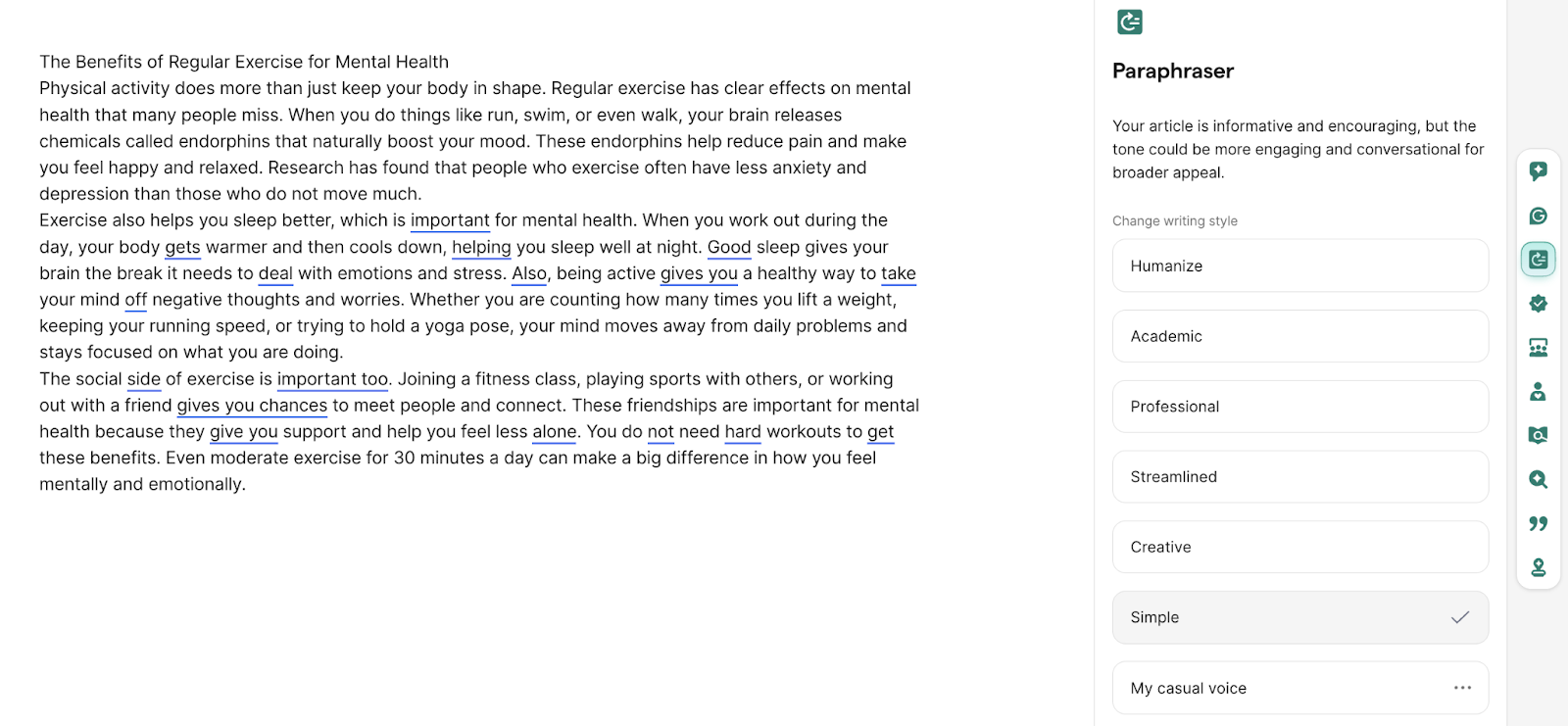 Grammarly’s paraphrasing was of good quality. I had set the writing style to Simple, and the paraphrased text further simplified the already basic text. For example, it changed “When you engage in physical activities” to “When you do things like…”