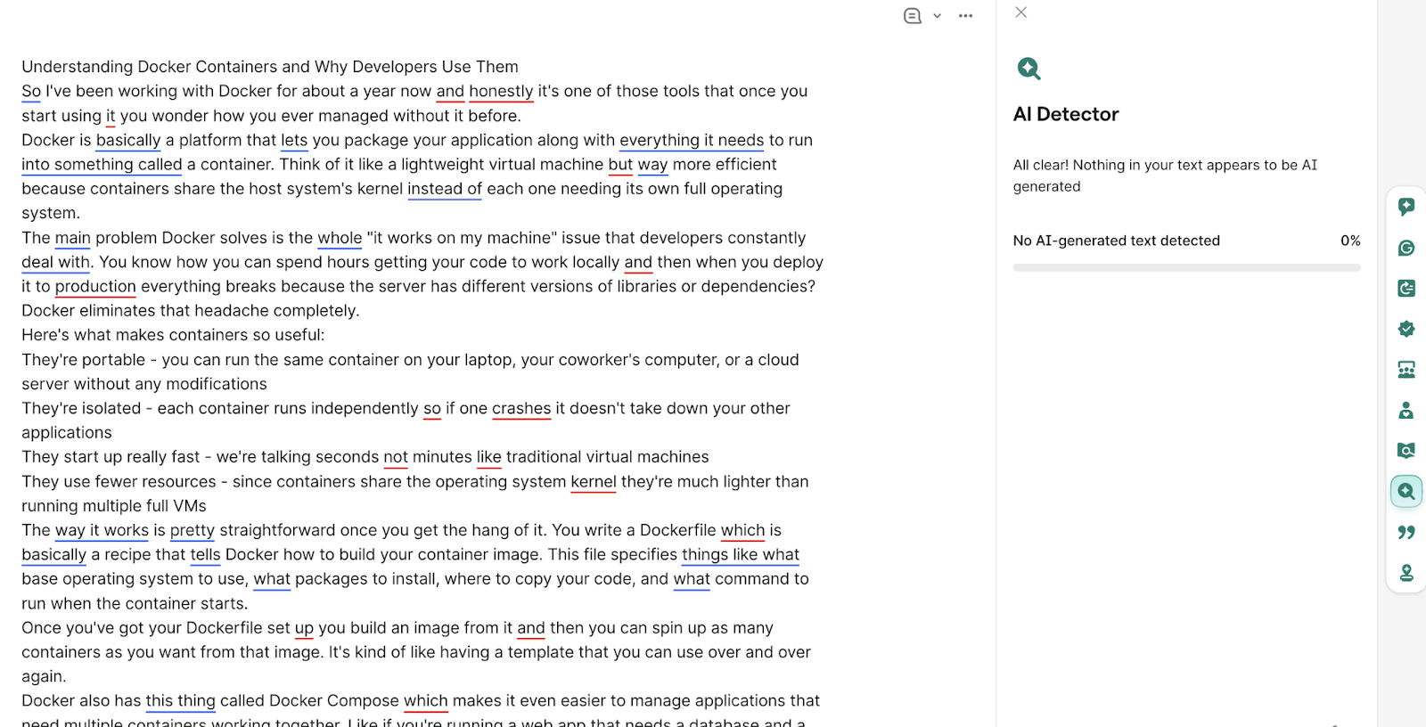 Based on my testing, the ZeroGPT vs Grammarly comparison comes down to the following results: